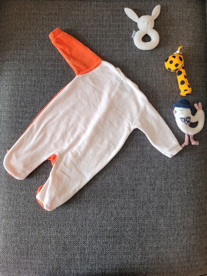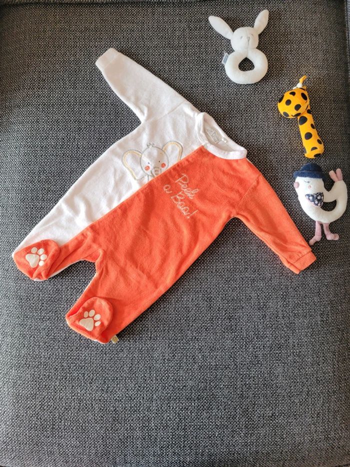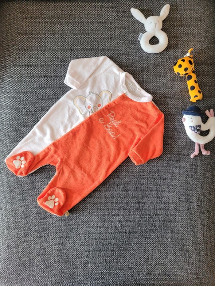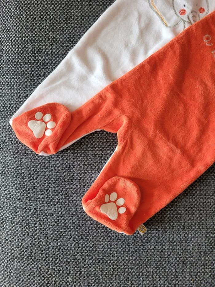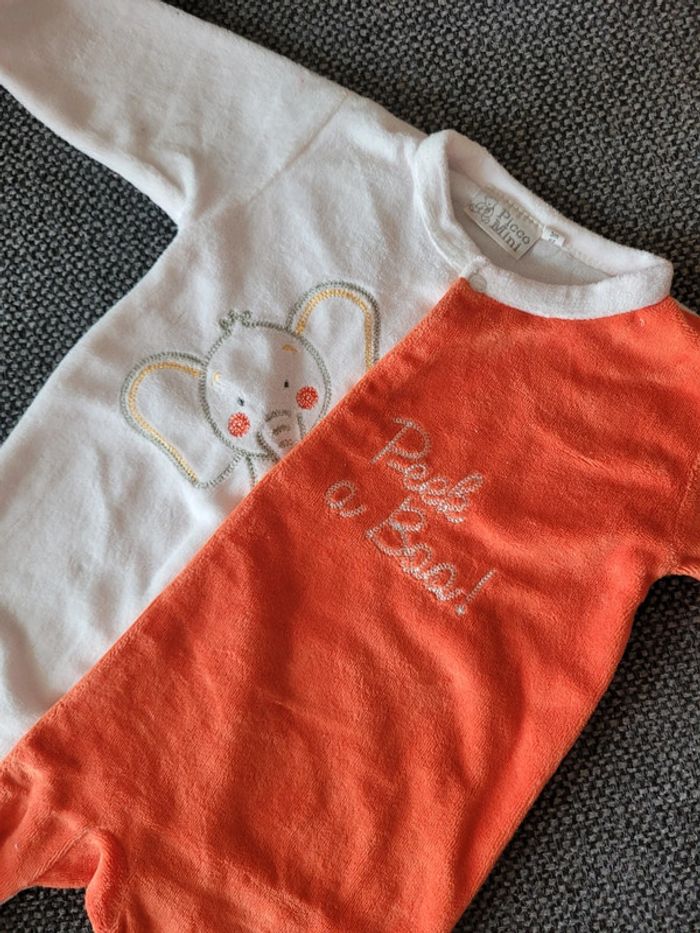 Pyjama mixte en velours de la marque Picco Mini et de taille 3 mois Blanc et orange avec motif éléphant, écriture "Peek a Boo!" et empreinte de patte sous les pieds Attache par pressions devant Aucune tâche ni trou #mabi38780mixte3mois #mabi38780garcon3mois #mabi38780fille3mois