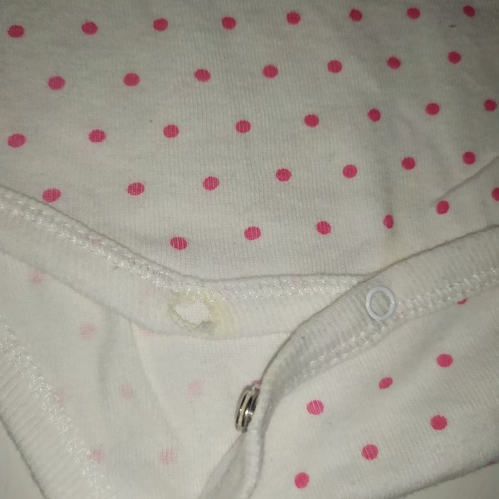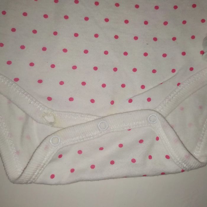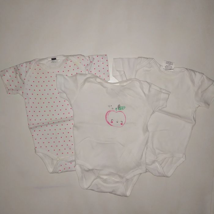 Lot de 3 bodies manches courte Taille 3 mois TISSAIA , celui avec des point rose a une pression qui s'est détachée du tissus mais reste fonctionnel ( j'ai observée une petite tache sur l'épaule de ce dernier mais très légère )