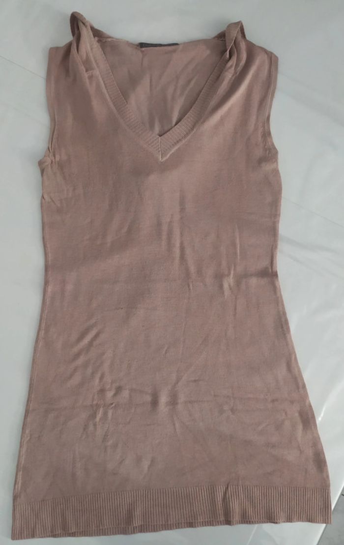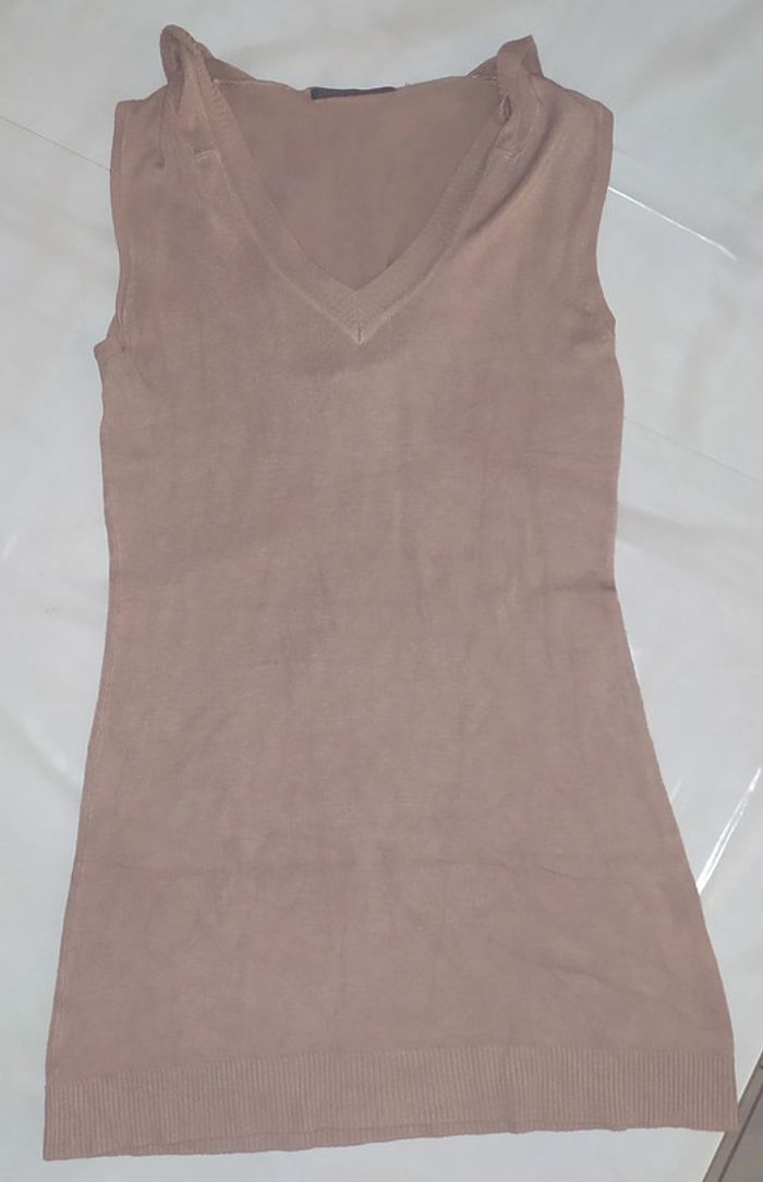 pull mis long femme à capuche col V sans manche , couleur taupe claire, taille 38/40 . peut se porter avec un jean ou un legging, avec une ceinture cela habille aussi . de très légères bouloche sur le coté au niveau des hanches .