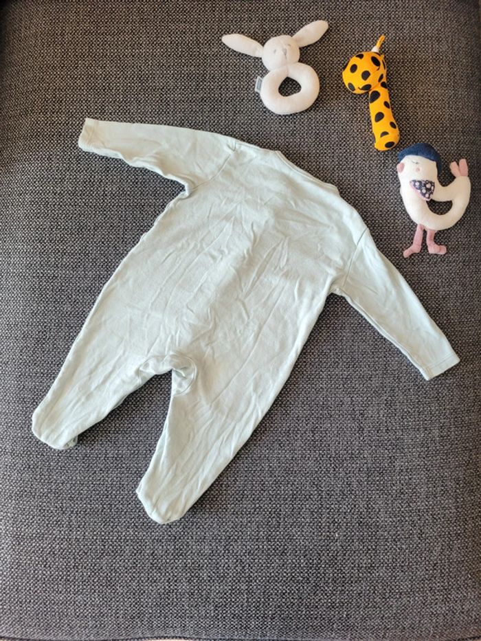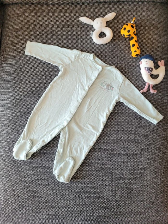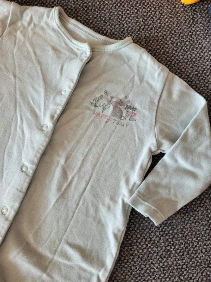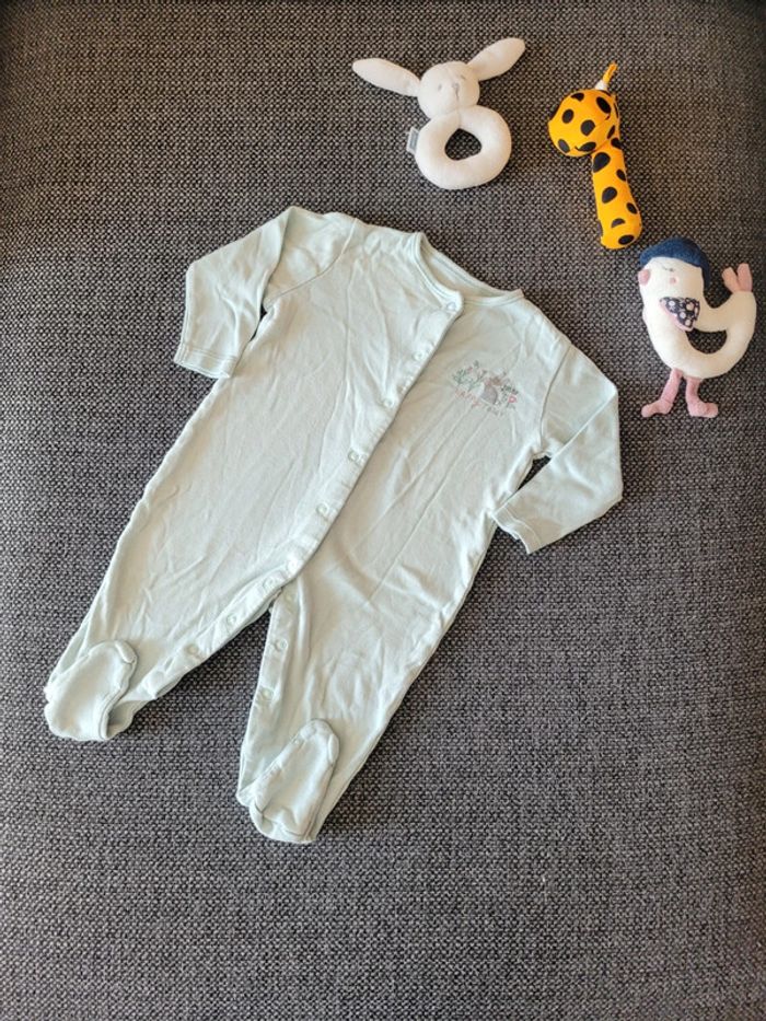 Pyjama fille 1 pièce en coton de taille 6-9 mois et de marque Primark Vert d'eau à motif lapin et fleurs Fermeture par pressions à l'avant Aucun trou. Juste une très légère tâche à l'arrière au niveau de la couture qui se voit à peine. #mabi38780fille6mois #mabi38780fille9mois