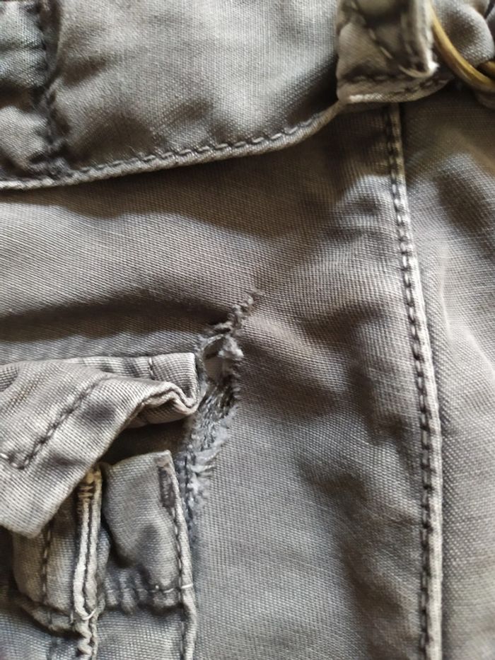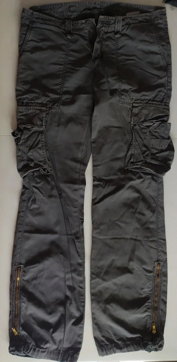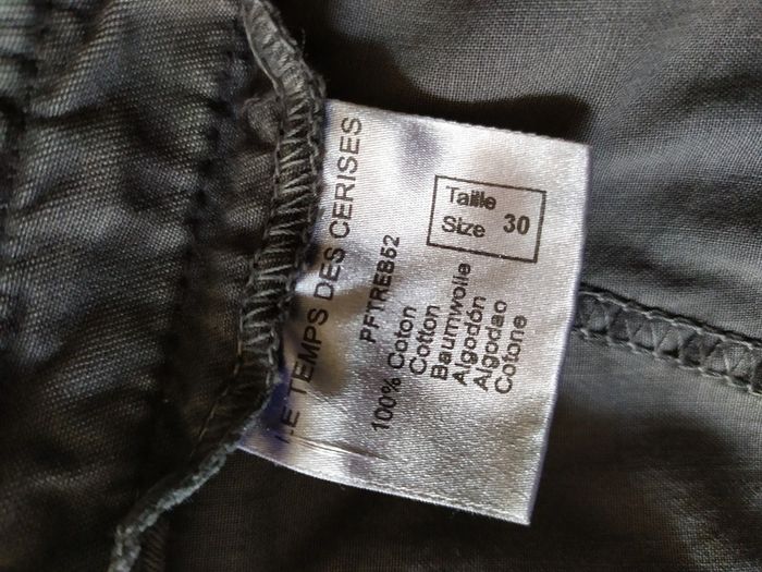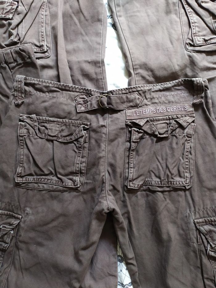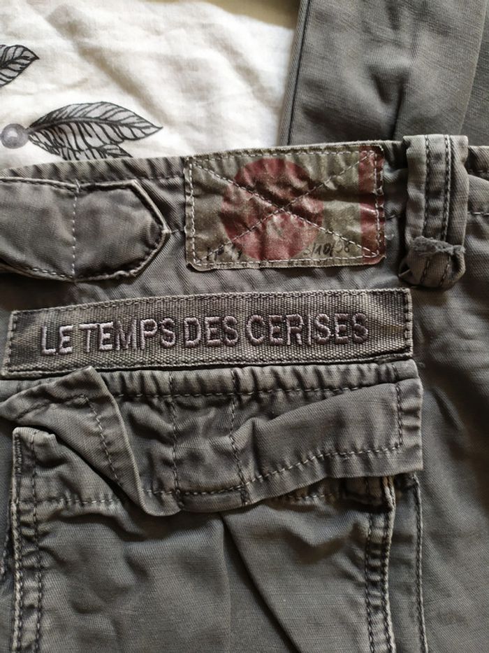 Battle LE TEMPS DES CERISES, taille 30 ( taille us),mais équivaut a un jean taille 38 ; je peux mesurer au besoin , multi poches, fermeture éclaire en bas des jambes et peut se resserrer avec un lacet , 100 % coton a coté de la poche arrière le tissu est déchiré suite à un accrochage peut être recousu ou mettre une pièce de tissu a l'intérieur par manque de temps je n'ai pas pu le faire ( gris plus foncé que l'autre annonce)