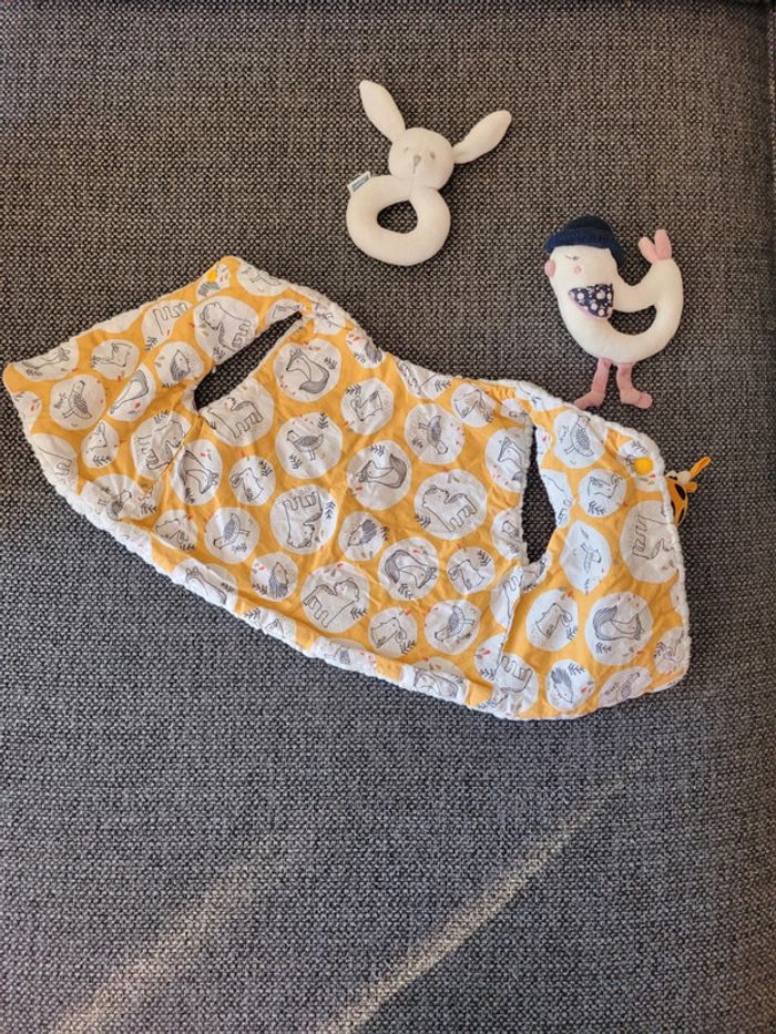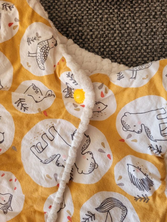 Gilet sans manche pour fille de taille 18 mois et fait main Réversible avec une face fourrée blanche et une face en tissu jaune moutarde à motifs animaux de la forêt. Attache avec une pression devant. Aucune tâche ni trou. #mabi38780fille18mois
