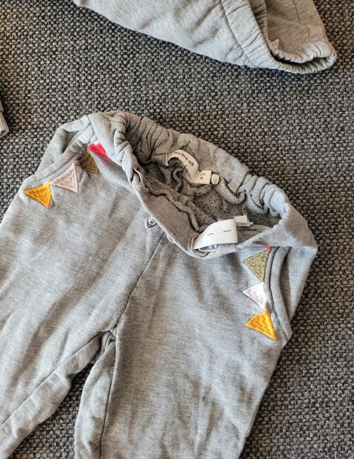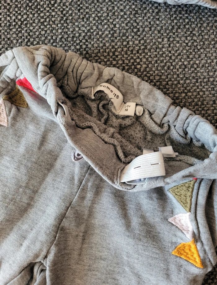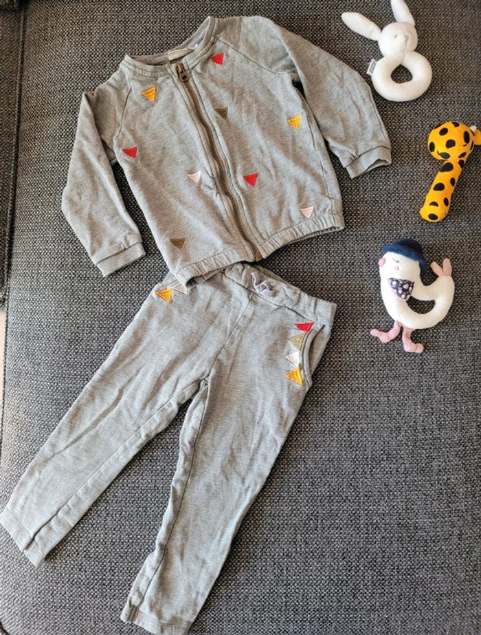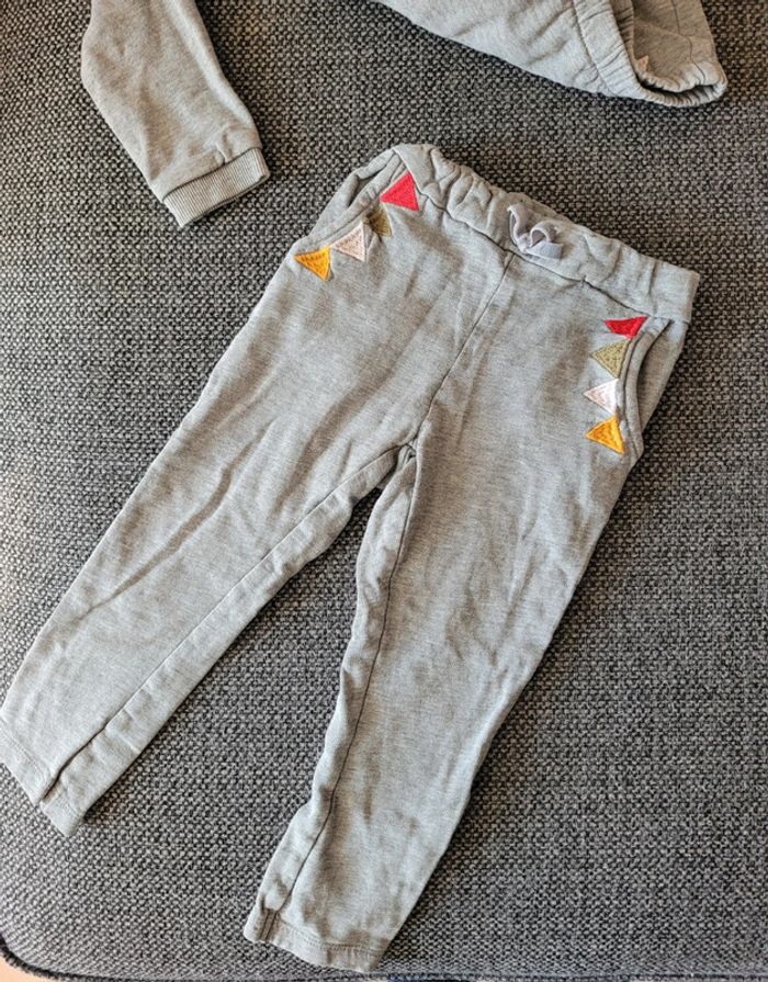 Ensemble molletonné pour fille de la marque Name it et de taille 2-3 ans 98 cm (équivalent 3 ans) Composé d'une veste zippée et d'un pantalon type jogging assortis Taille ajustable pour le bas Motifs graphiques triangles brodés Aucune tâche ni trou #mabi38780fille3ans