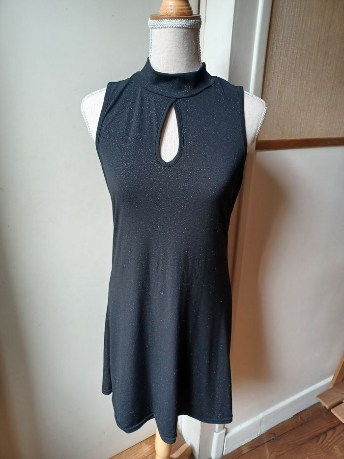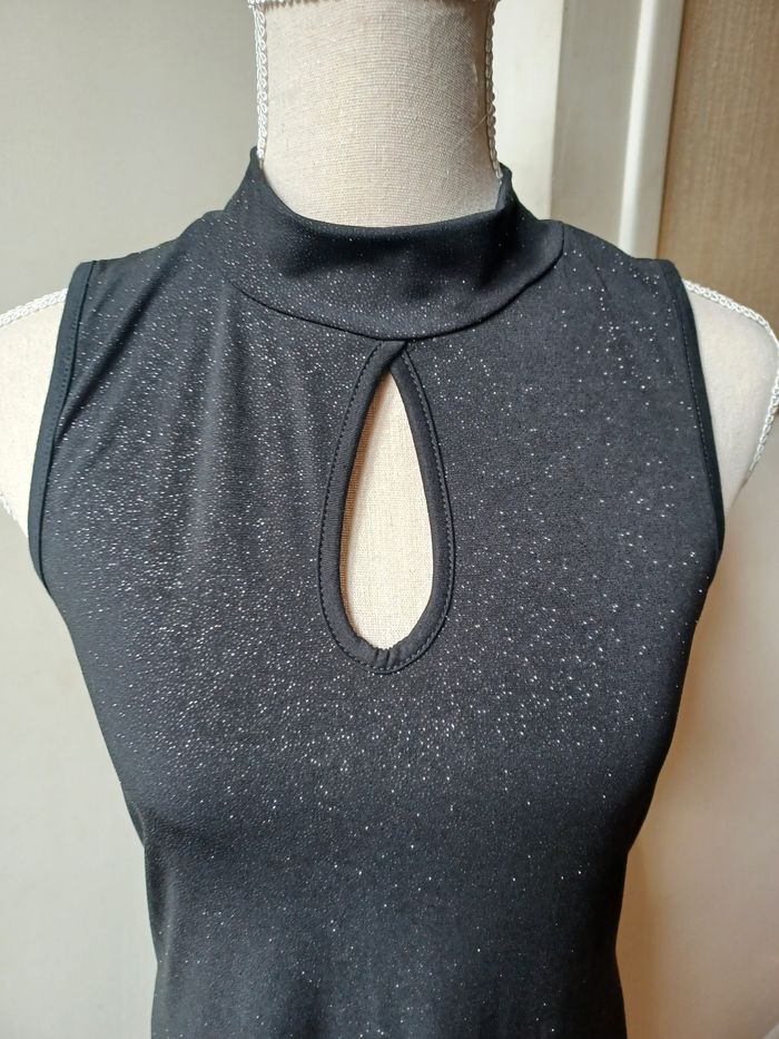 Robe noire pailletée, vol rond,ouverture "larme" sur le devant.