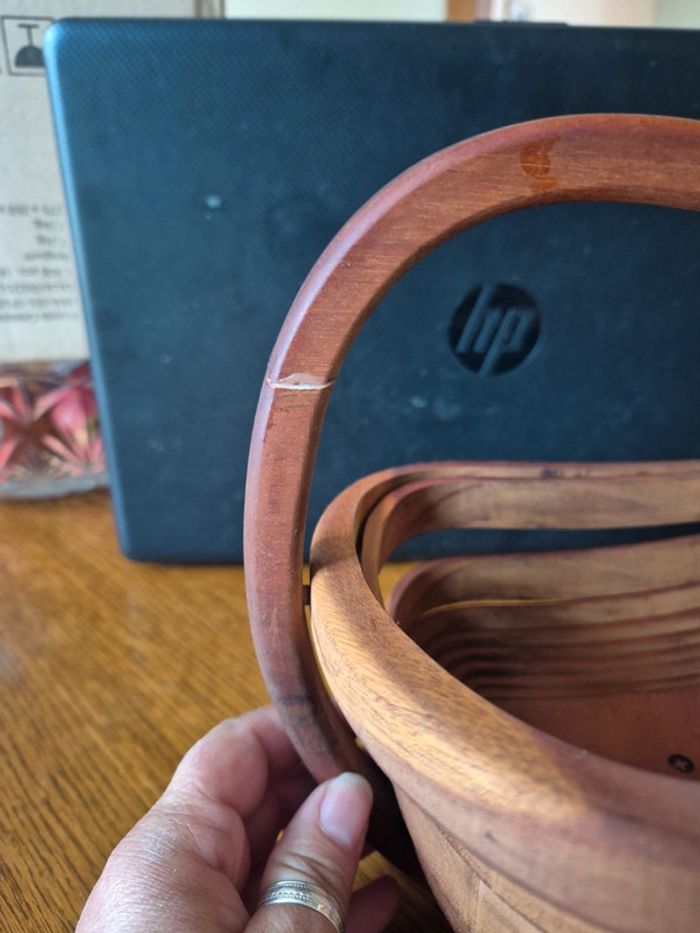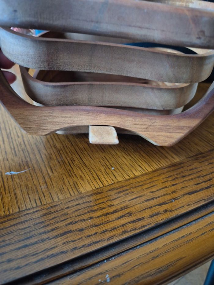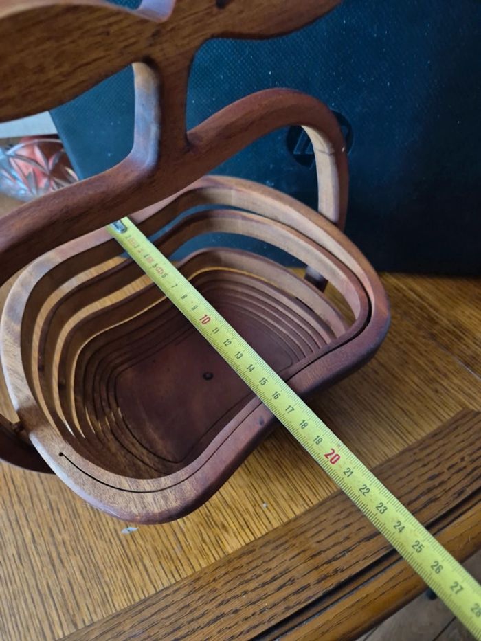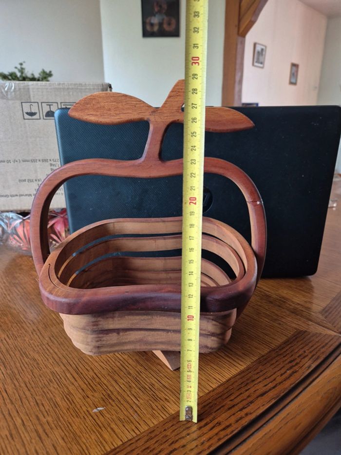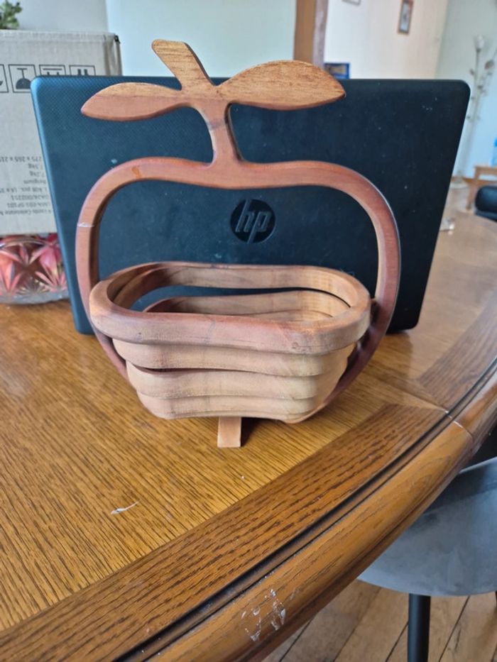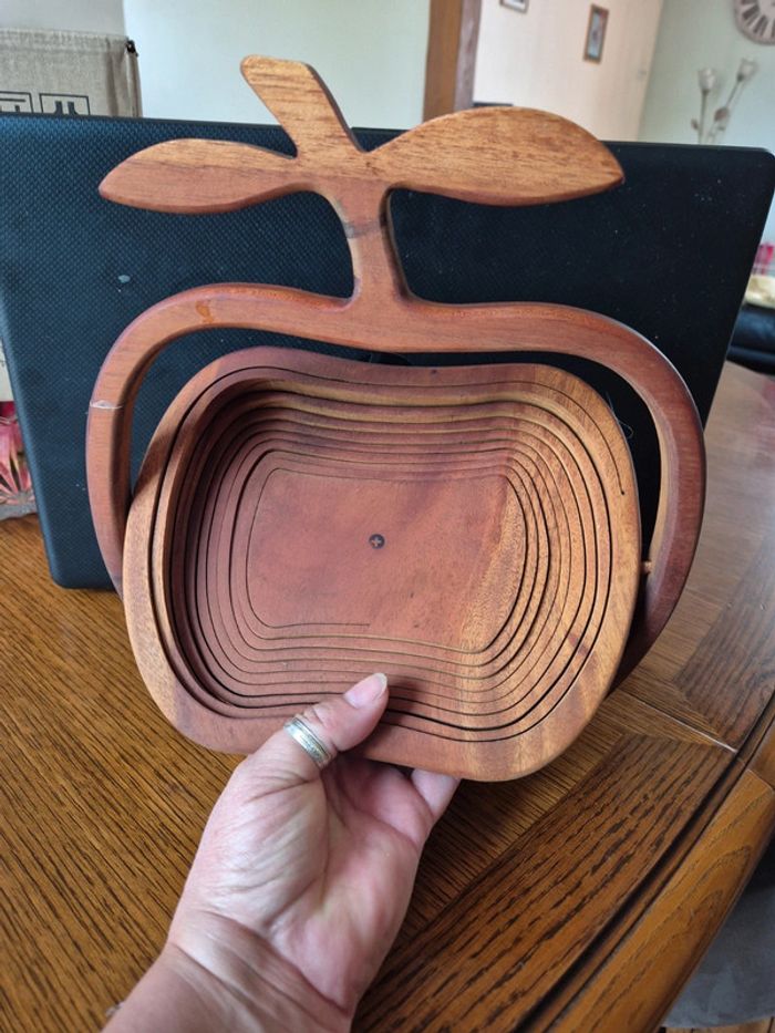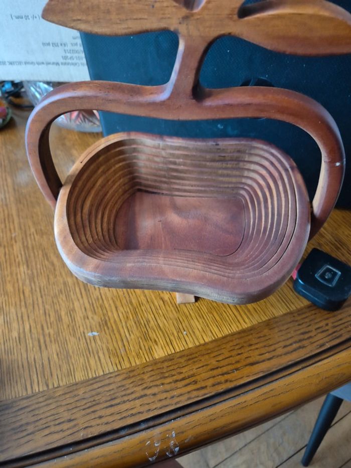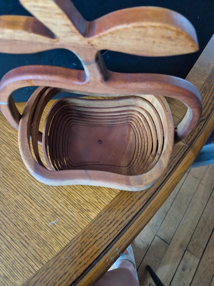 ⬇️mes autres annonces d'article de maison, décoration👉 #cg89déco une coupe de fruits en bois en forme de pomme qui se repli sur elle meme, le pied se pli également. il mesure 29 cm x 16 cm x 22 cm le bord de la coupe a été recollé (voir photo) bon état #coupe #bois #fruit #decoration