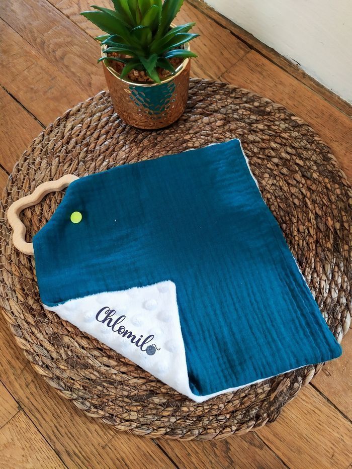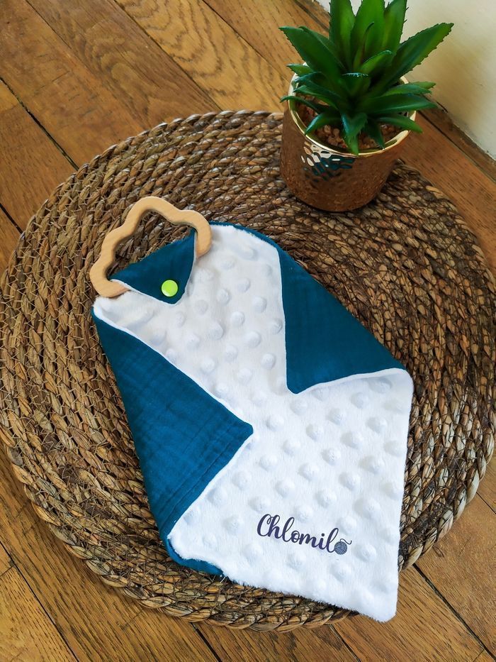Doudou plat avec anneau de dentition Un côté en minky ultra doux , l'autre côté en gaze de coton. Différents coloris pour les tissus et différents modèles d'anneaux en bois. L'anneau en bois peut facilement s'enlever grâce à une pression pour être remplacé par une attache tétine par exemple. Possible de broder un prénom (+4) ou en flocage (+2€) N'hésitez pas à me contacter pour plus d'infos 😉