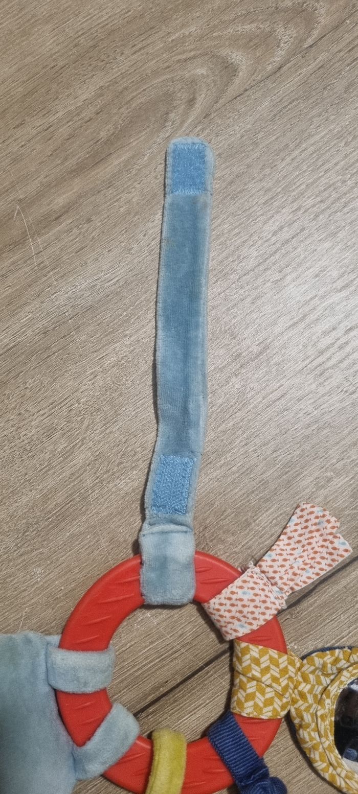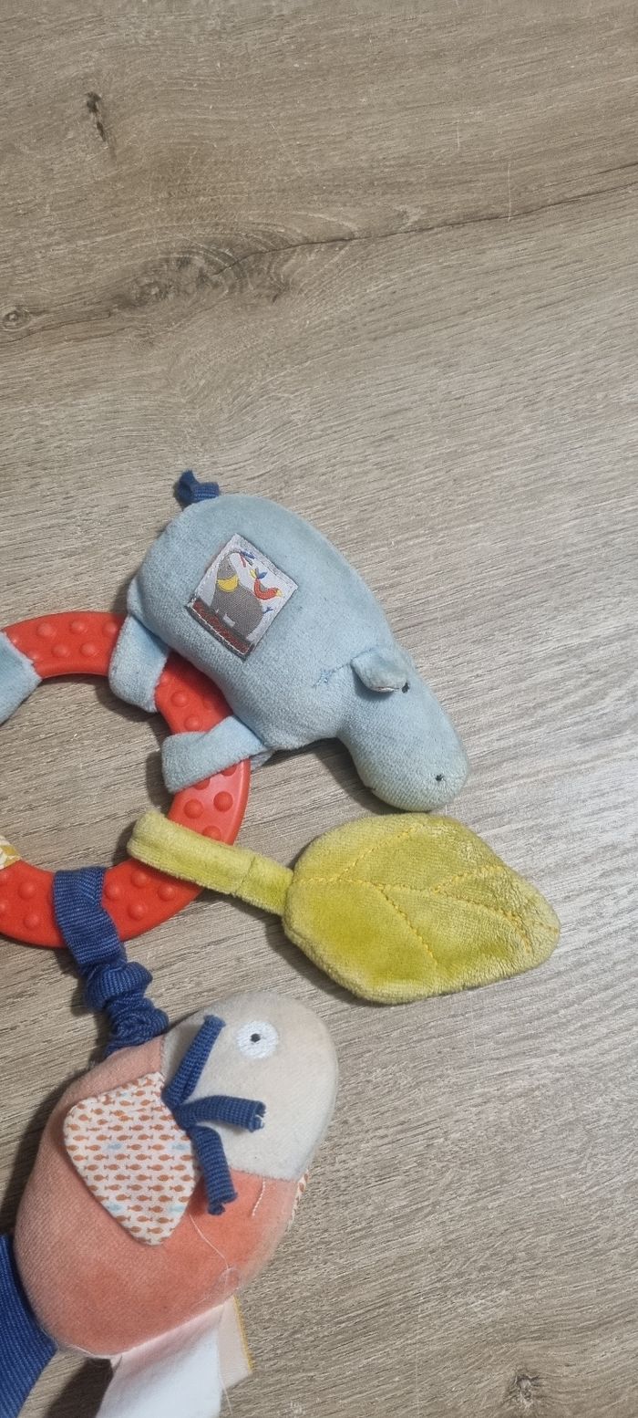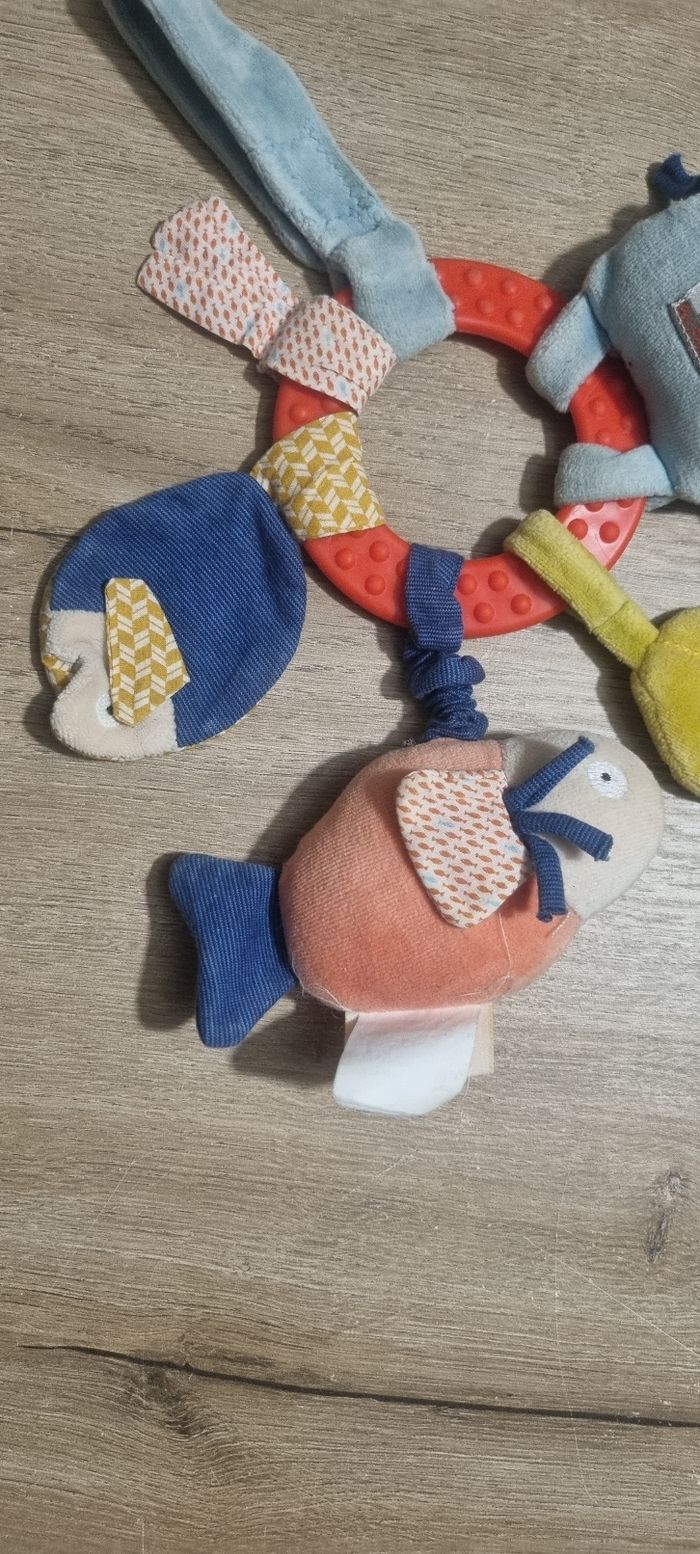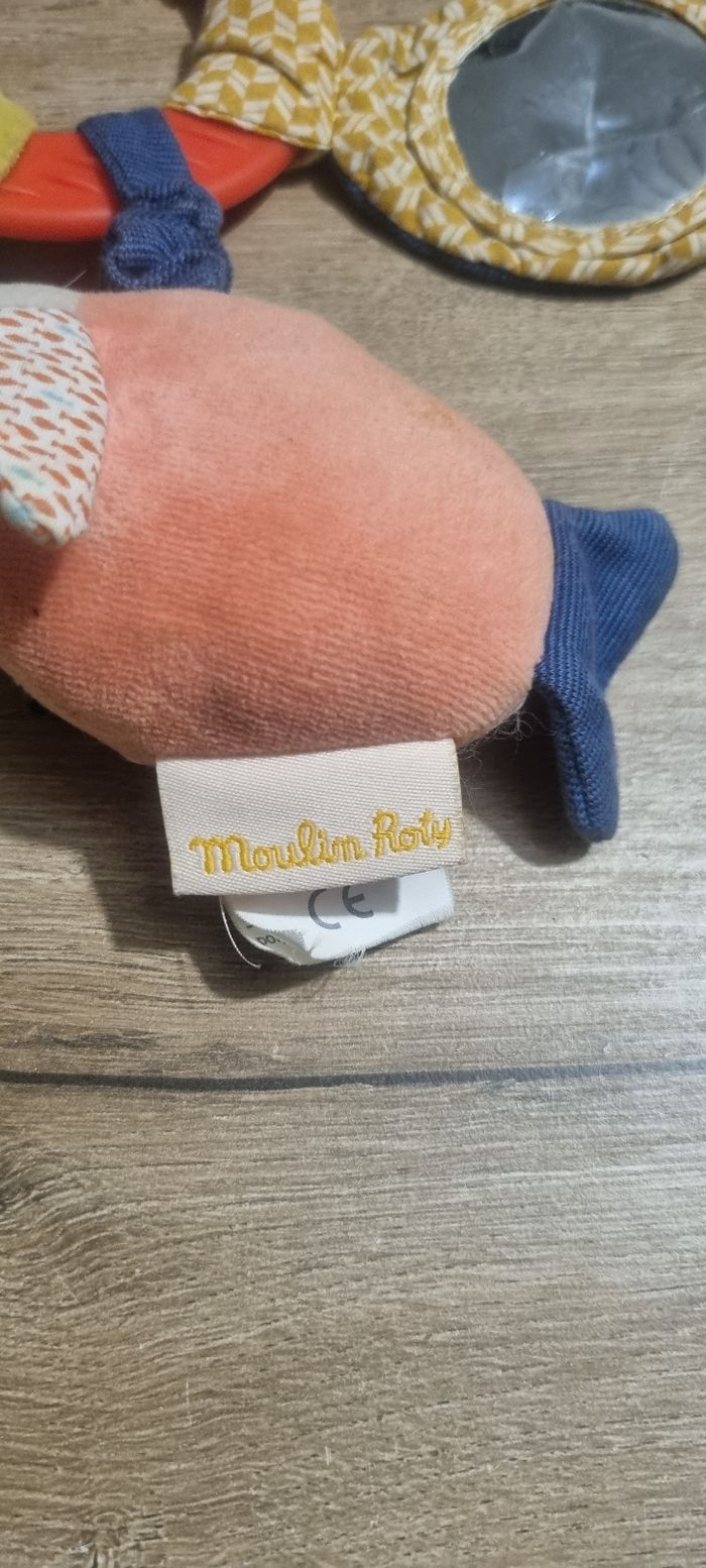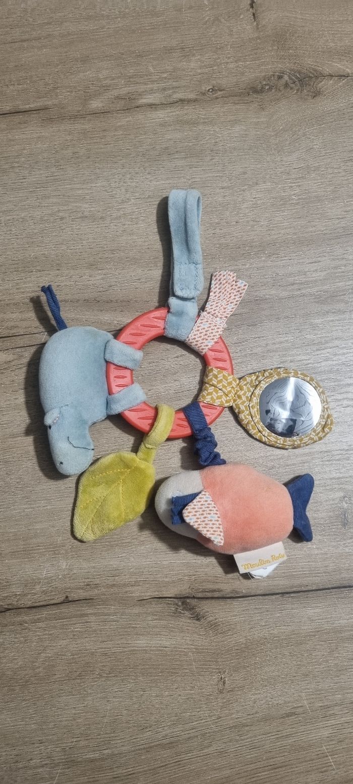 Anneau hochet hippopotame avec anneau de dentition Poisson vibreur, miroir poisson (abimé), feuille de velours au bruit de papier froissé, rubans, attache tétine ou lien pour le suspendre Moulin Roty thème "Les papoum" Bon état