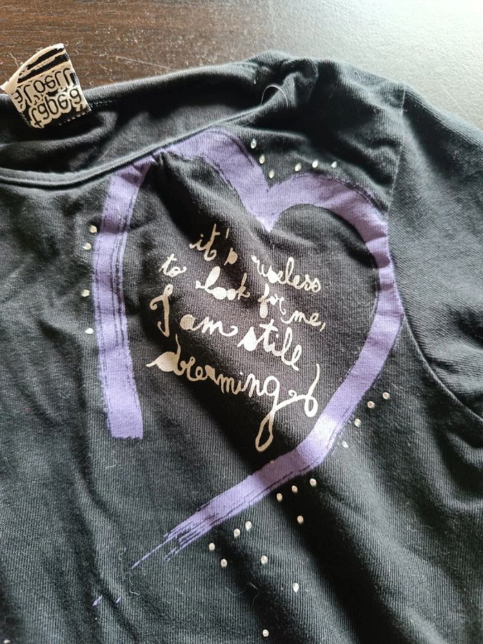 Haut TAPE À L' OEIL Noir Impressions beiges & violettes Strass Manches longues 100% Coton TAILLE 4 ANS TRES BON ETAT Allez voir mes autres ventes!