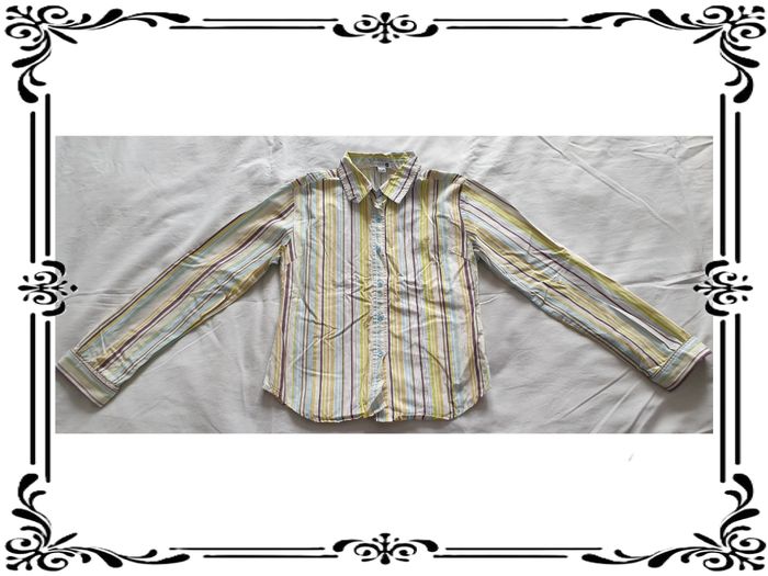 Chemise 8 ans. Chemise à rayures multicolore. 100% coton. Manches à revers. Largeur d'épaule à épaule: 31 cm Longueur: 46 cm Longueur des manches: 46 cm En très bon état. Zara. 2.00€. #vero38110huitansfille