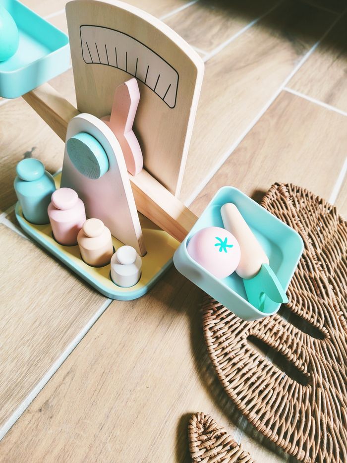 🍒 Balance de cuisine/ marchand(e) fruits et légumes en bois Montessori couleurs pastels