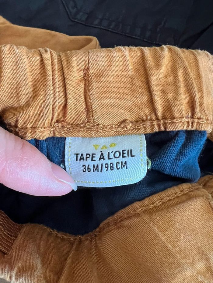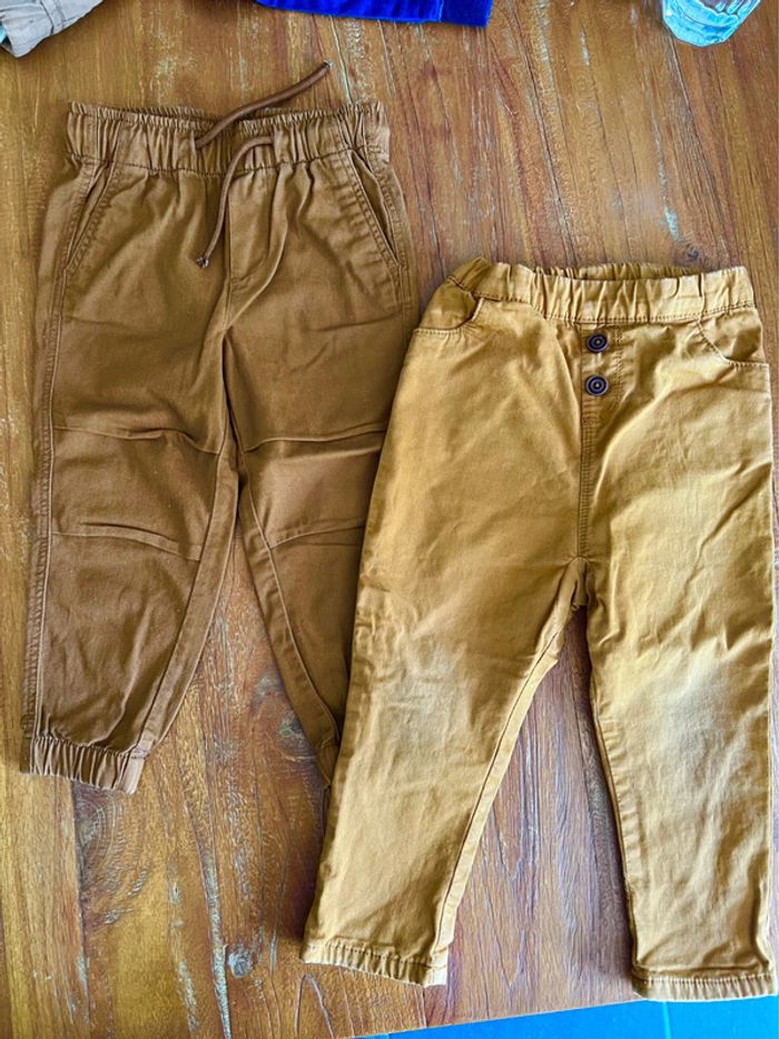 Vends lot de 2 pantalons: - 1 couleur marron, avec genoux plissés, marque H&M (l’étiquette mentionne 2 ans mais taille grand) - 1 couleur moutarde, genoux un peu usagés, marque TAPE À L’ŒIL