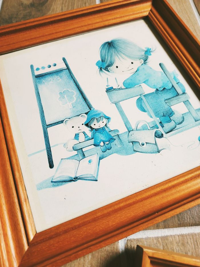 🖼️Lot de 2 cadres en verre et bois avec affiches petites filles années 70' vintage