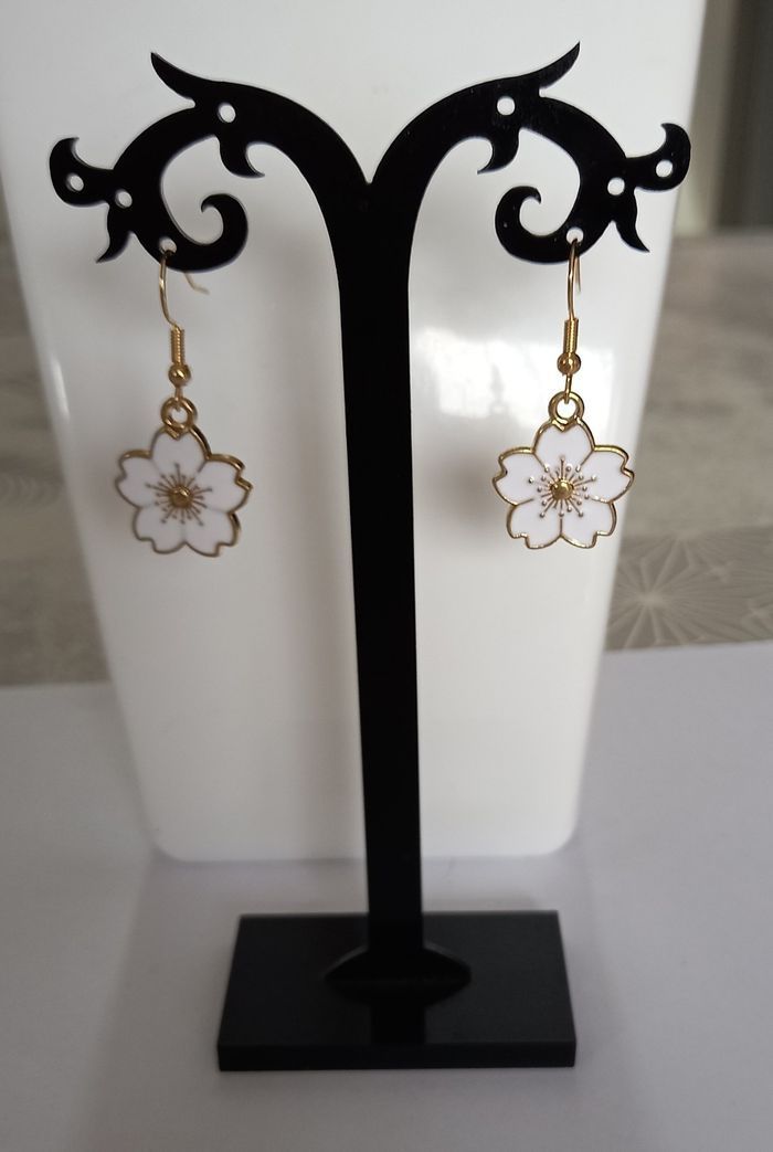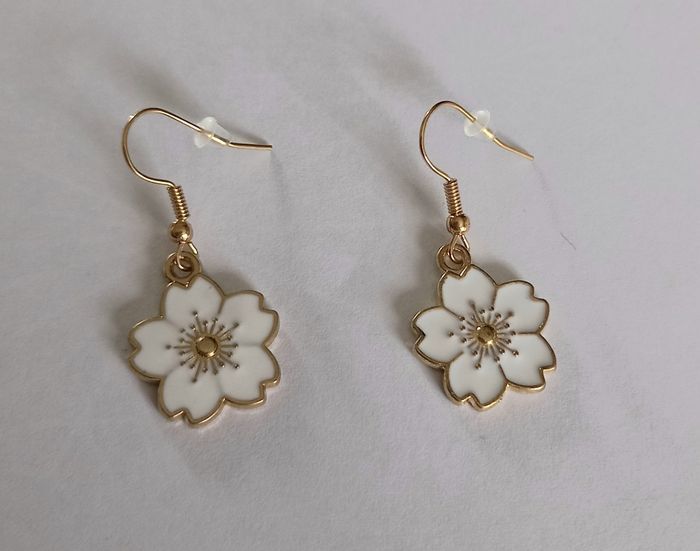1 jolie paire de boucles d'oreilles motif fleur blanche et doré. Hauteur : 3,8 cms. Boucles neuves sous blister. N'hésitez pas à regarder mes autres ventes. Envoi rapide et soigné.