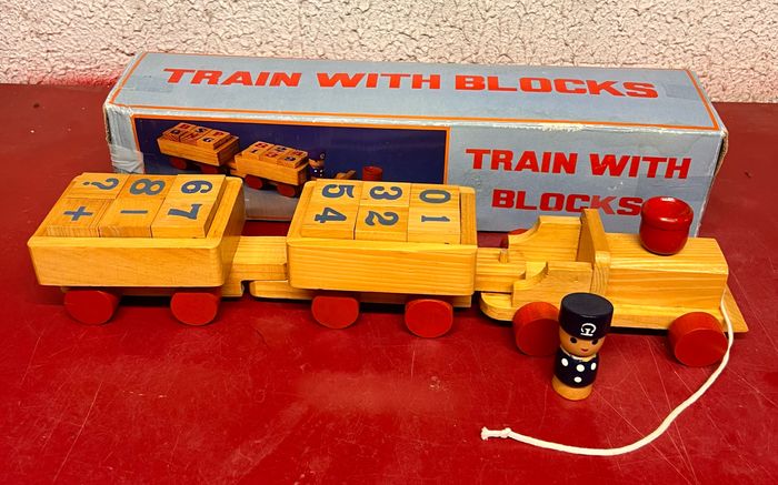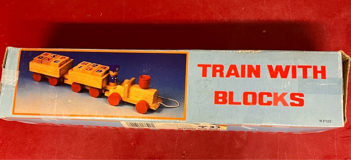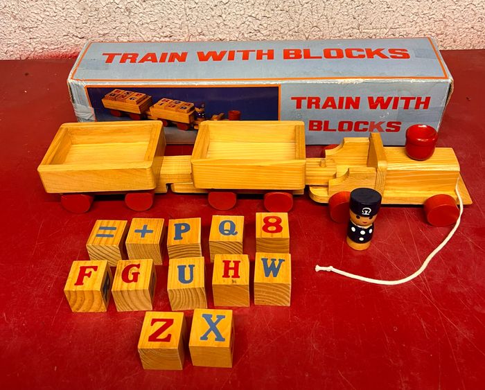 Train en bois de 38 cm de long Avec 12 cubes marqué sur les 4 faces chiffres, lettres