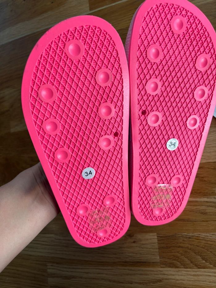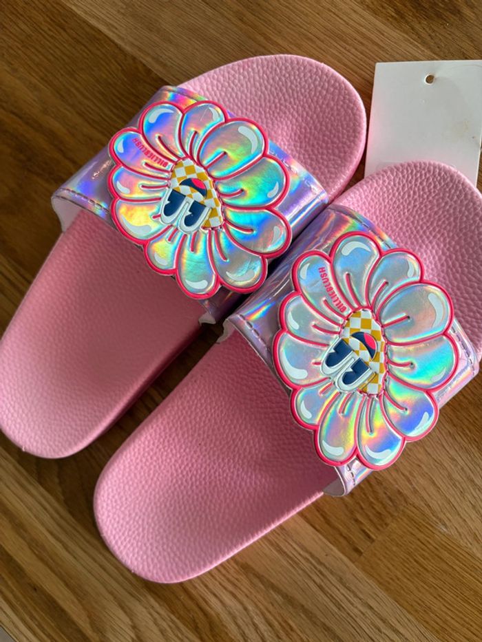 Très belles claquettes. Brillantes avec fleurs qui sourient. Neuves, achetées 39€. Pour pieds plutôt larges, ma fille a les pieds très fins. Jamais portées. Pointure 34. PRIX FERME N’hésitez pas à consulter mon dressing des réductions s’appliquent en cas de lot.