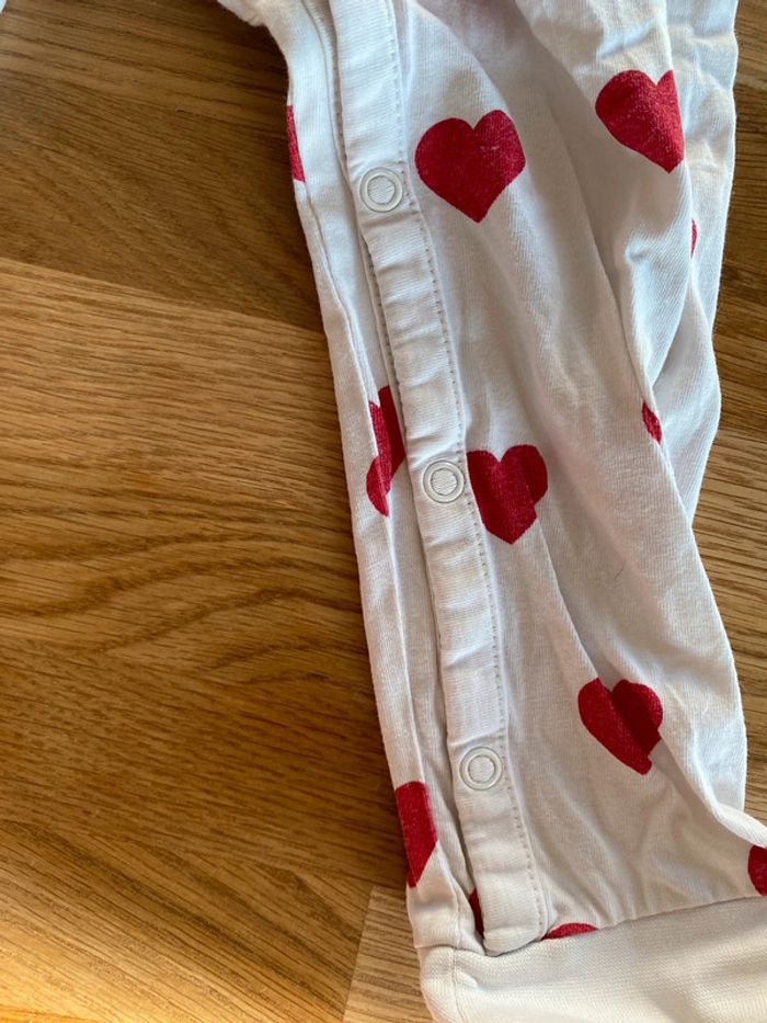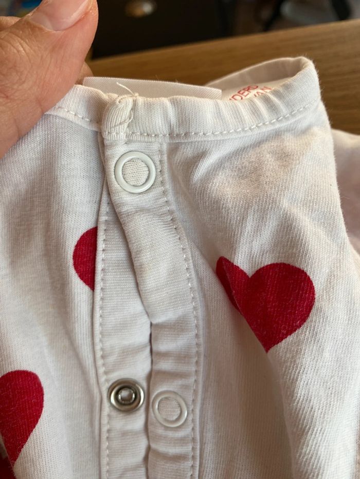 Un pyjama H&M avec coeurs, sans pieds, pratique avec les boutons pression tout le long. Légèrement jauni au col, voir photo. Autre pyjama avec coeurs sur le devant. Boutons pressions au dos. Pyjama avec pieds. N’hésitez pas à consulter mon dressing, des réductions s’appliquent en cas de lot.