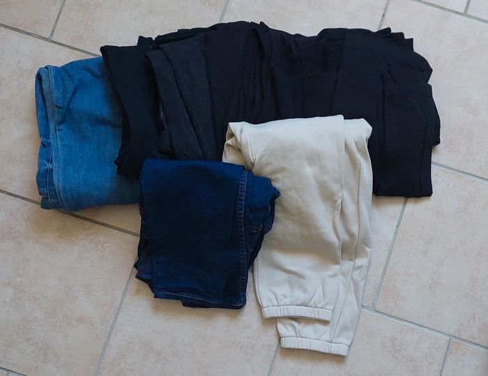 1 jean mamalicious 27/32 1 jean bleu kiabi 36 1 jean noir kiabi 36 1 pantalon noir survêtement prénatal S 1 pantalon noir gemo M 1 jogging beige kiabi S 1 legging collant séraphine S/M 1 pantalon kiabi noir - état moyen
