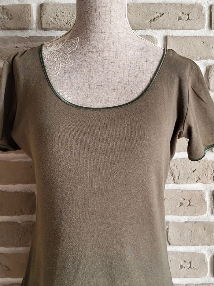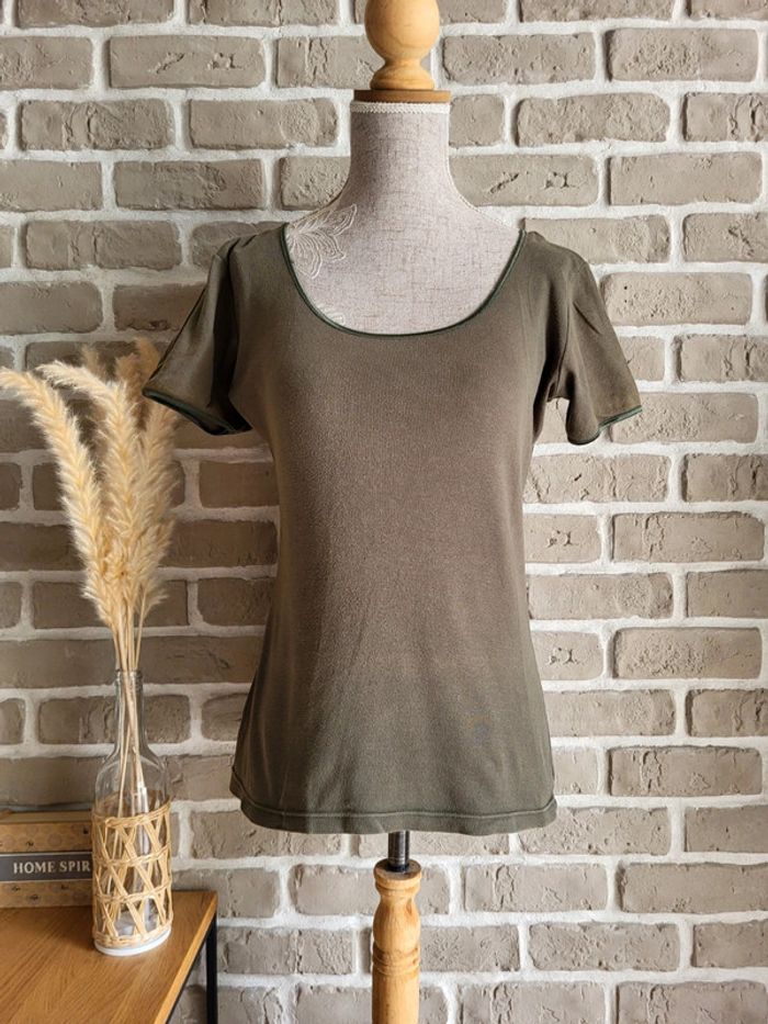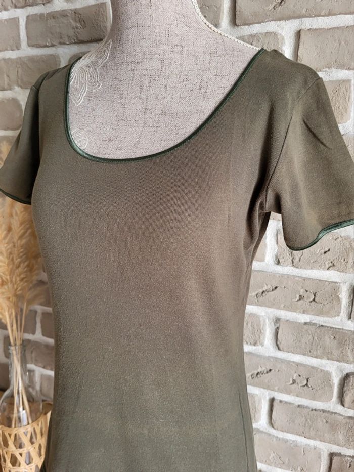 💝 Bénéficiez d'une réduction en créant lot dans mon dressing 🛍️ 🌸 T-shirt kaki délavé, vintage mais en bon état 🎀 En coton avec un petit liseré satiné au col et aux manches 🍥 Taille S 36 Longueur : 96 cm 🩷 Coupe classique et intemporelle qui s'accordera à la perfection avec un pantalon en lin ou en coton brut. Complétez avec un gilet en maille épaisse, des bijoux en bois ou en pierres naturelles, un sac en macramé et vous obtiendrez un look roots et bohème très sympa