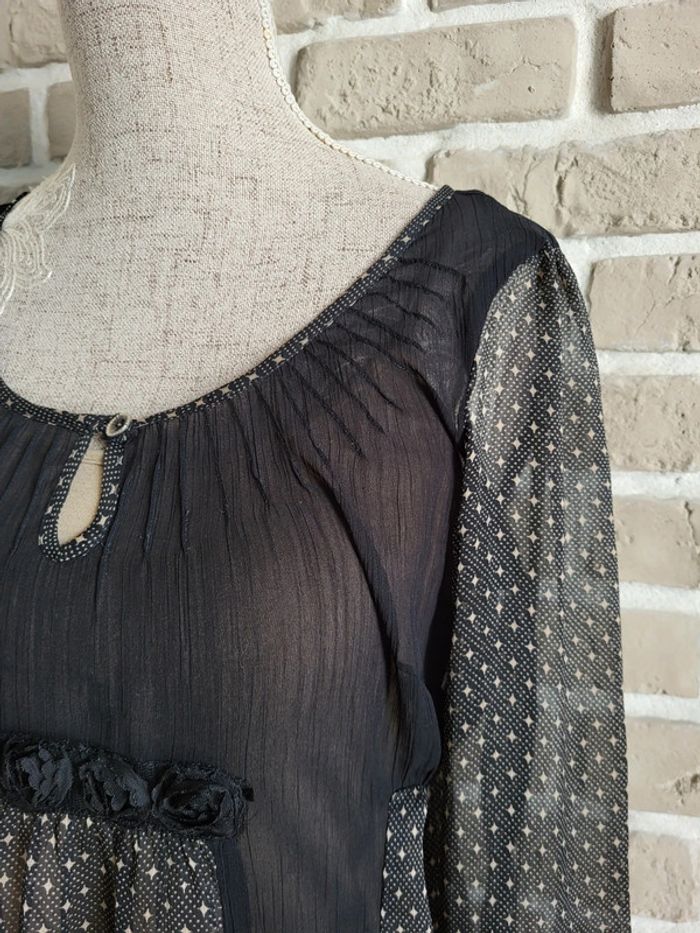 💝 Bénéficiez d'une réduction en créant lot dans mon dressing 🛍️ 🌸 Très jolie tunique, 2 en 1, de la marque DDP Elle date du début des années 80 et elle est en parfait état 🎀 Voile léger et vaporeux aux multiples détail dans les tons noirs et beige/taupe Doublé d'un long débardeur aux fines bretelles réglables (celui-ci est un peu bouloché mais ce n'est pas gênant 🪷 Coupe évasée, col fermé par un joli petit bouton métallique Manches 3/4 terminé par de la dentelle Fleurs en tissu cousu sous la poitrine Bas volanté 🍥 Taille XS 34 qui convient également à une taille S 36 🩷 Un style ultra romantique dans lequel vous vous sentirez bien Superbe avec un jean slim noir, des sandales à talons et quelques bijoux dorés