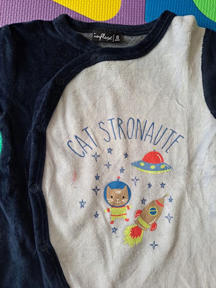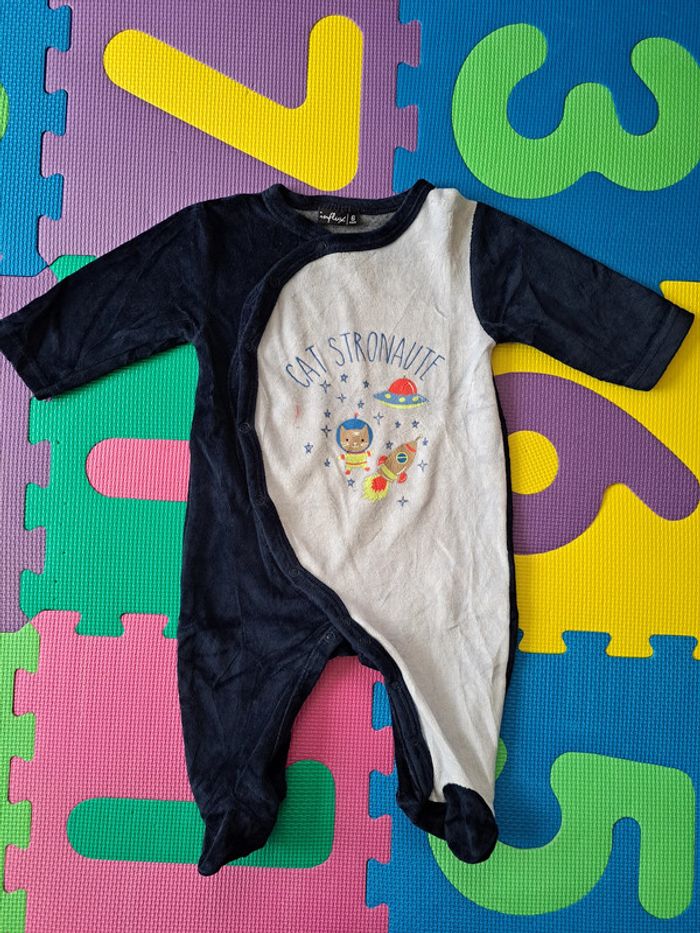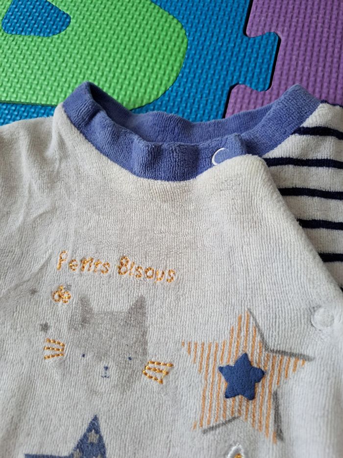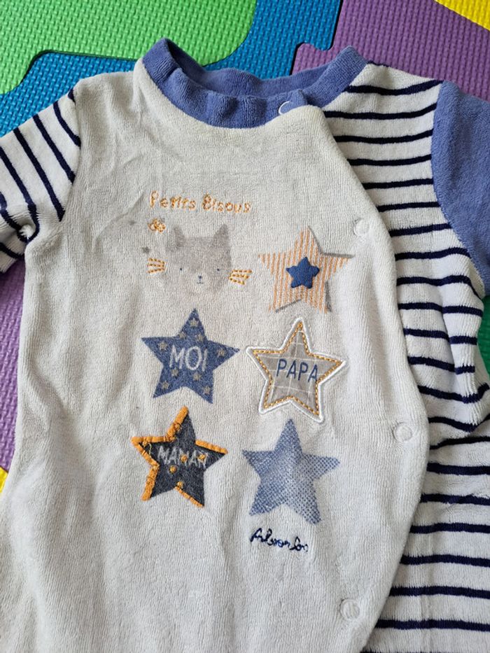 Afin de pouvoir financer les frais paramédicaux de nos enfants, j'offre une seconde vie à notre dressing. Merci de bien regarder les photos et lire la description : Lot de 3 pyjamas velours, taille 6 mois : • Pyjama Absorba • Pyjama Influx • Pyjama Smile Ouverture sur le devant, super pratique ! En très bon état. -> Les articles sont stockés dans des sacs sous-vides et peuvent être froissés -> RMP possible dans le département 54 / proche 88 (plus de précisions dans mon profil) 12ga