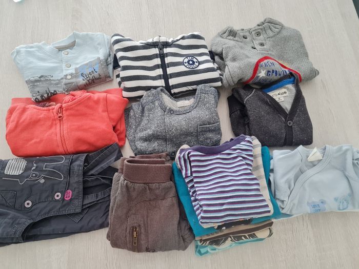 Besoin de place un gilet rouge une salopette un pantalon marron et un haut bleu en 3 mois Le reste est en 6mois il y a 3 gilets , un pull, 6 hauts manches longues , 3 bodys manches longues