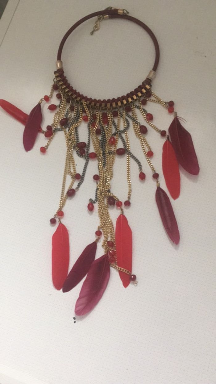 #chapitibijoux collier rouge et bordeau a plumes or et argent