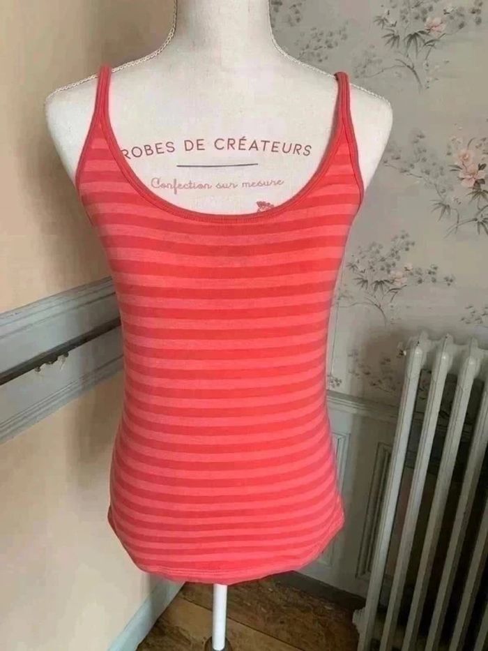 débardeur Camaïeu taille 2 . Rayé rose pâle et rose un peu plus foncé.