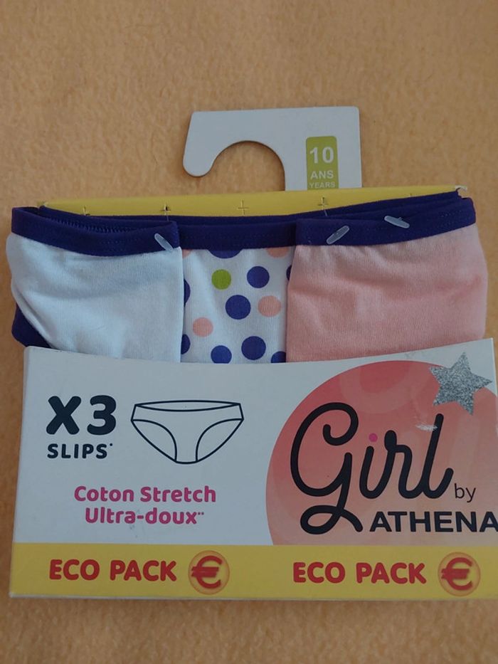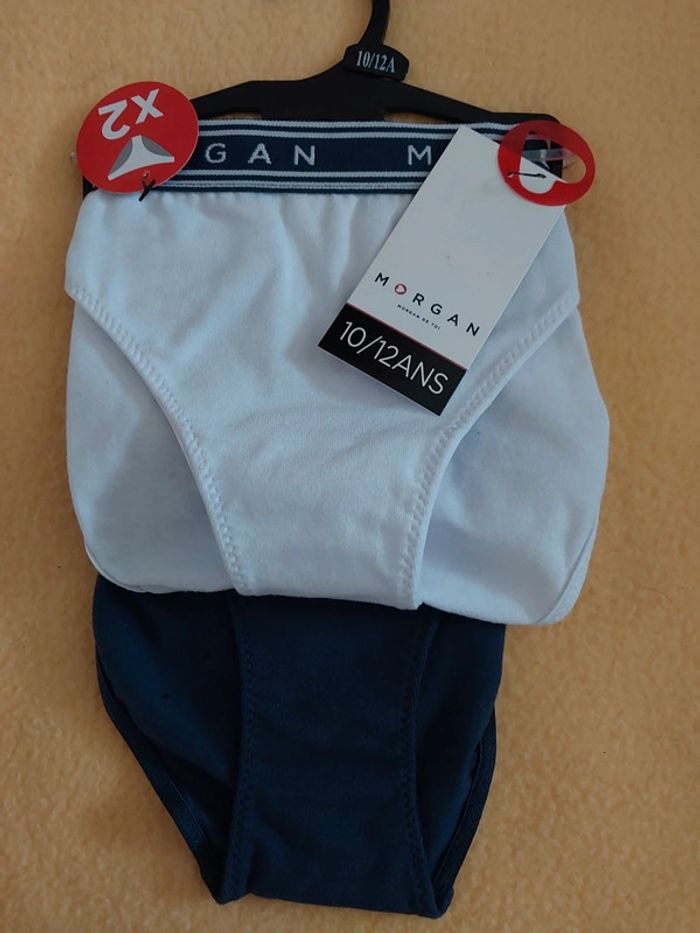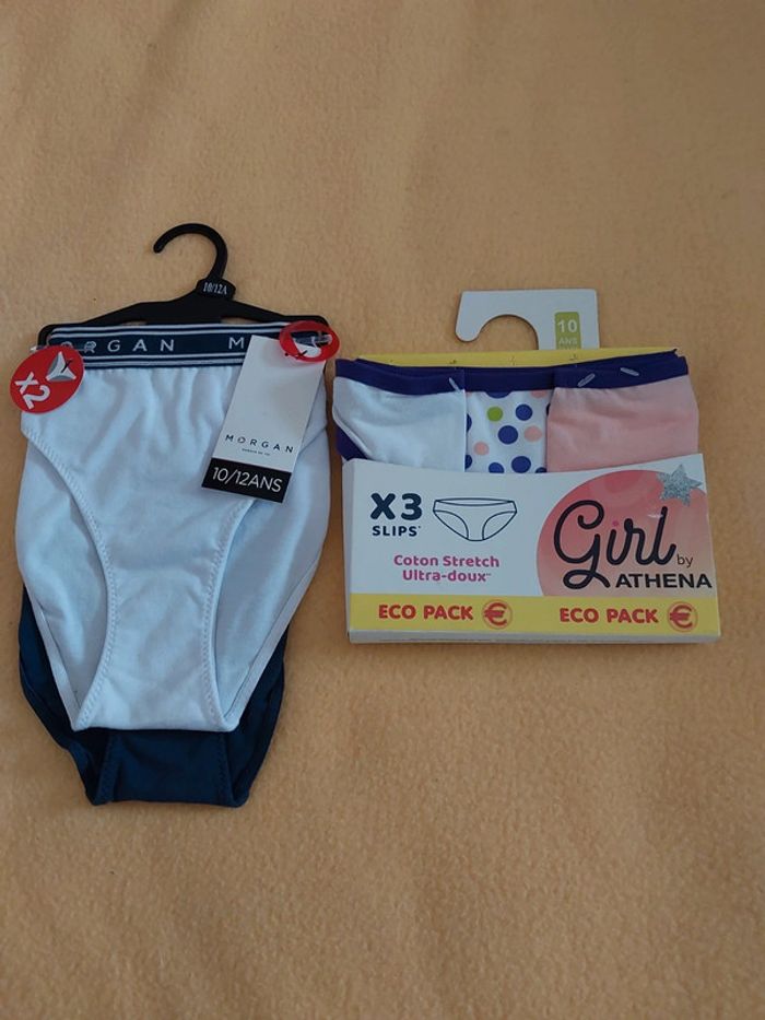 2 lots ainsi constitué : - 1 lot de 3 culottes Athéna 10 ans - 1 lot de 2 culottes Morgan 10/12 ans ( 1 blanche et 1 marine ) .