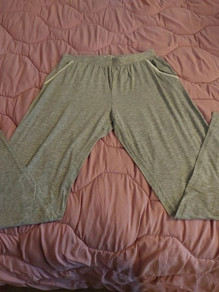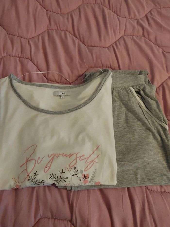 En viscose / polyester / elasthane . Le haut est crème , fleurs imprimées et inscription " be yourself . Le bas est gris chiné , 2 poches passepoilées . Excellent état car très peu porté .