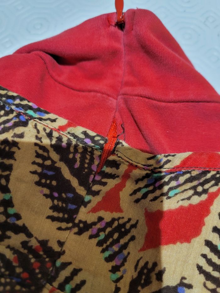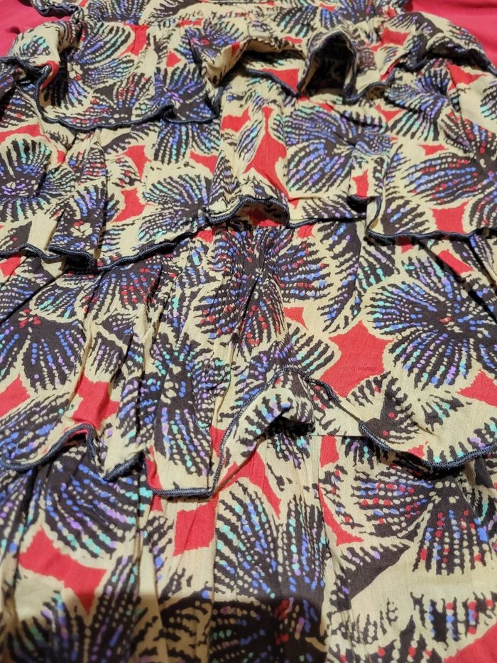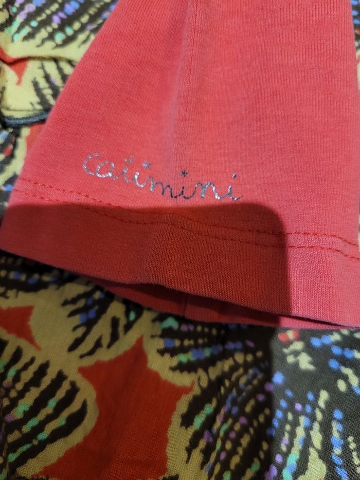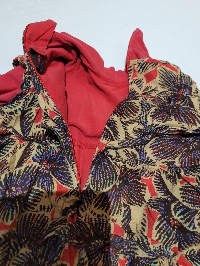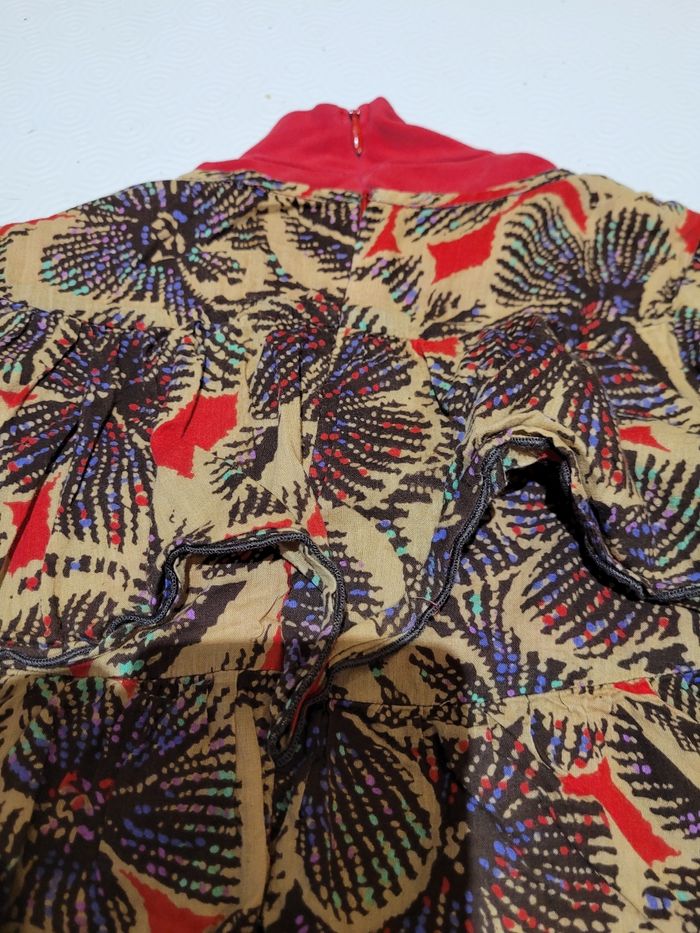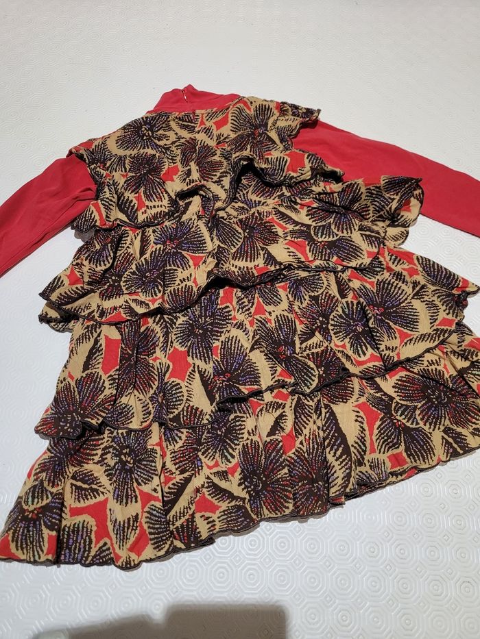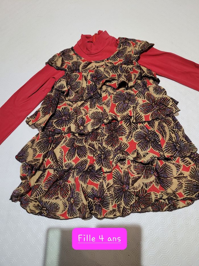 Robe courte avec manches longues et col haut . Effet sous pull avec robe. A volants. Marron, rouge, bleu, violet. Fermeture dans le dos. Couture décousue proche de la fermeture(voir dernière photo). Marque: Catimini. Taille : 4 ans.