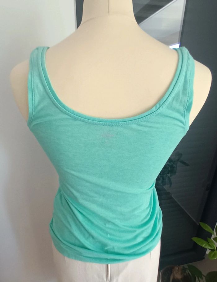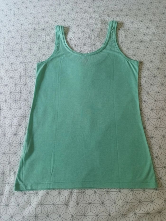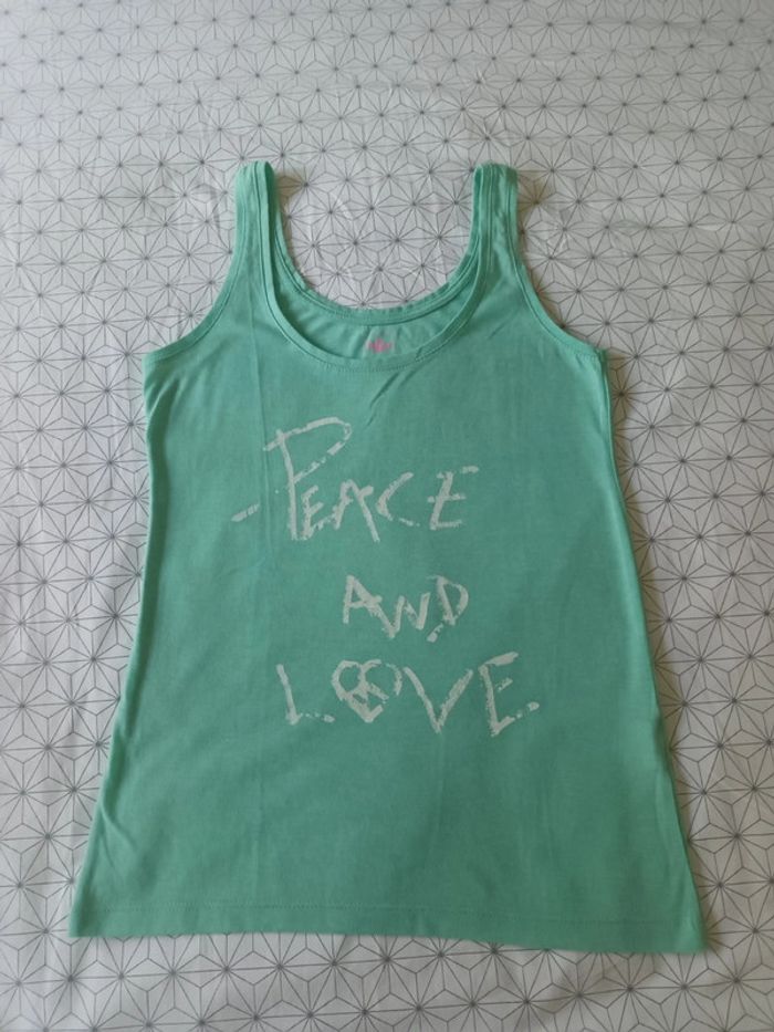 Débardeur léger vert clair, inscription devant : peace and love. 35% coton et 65% polyester. Noté taille XS, taille grand peut convenir à une taille 36. Largeur sous aisselles 39 cm env, Longueur 60 cm env. #debardeurfemme3436 #debardeurvertclairfemme3436 #debardeurlegerfemme3436 #debardeurkiabifemme3436