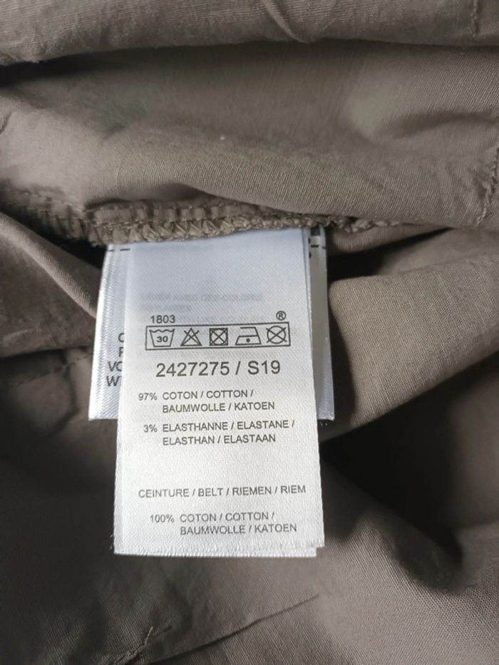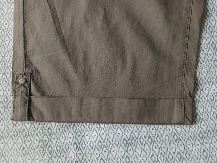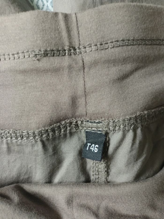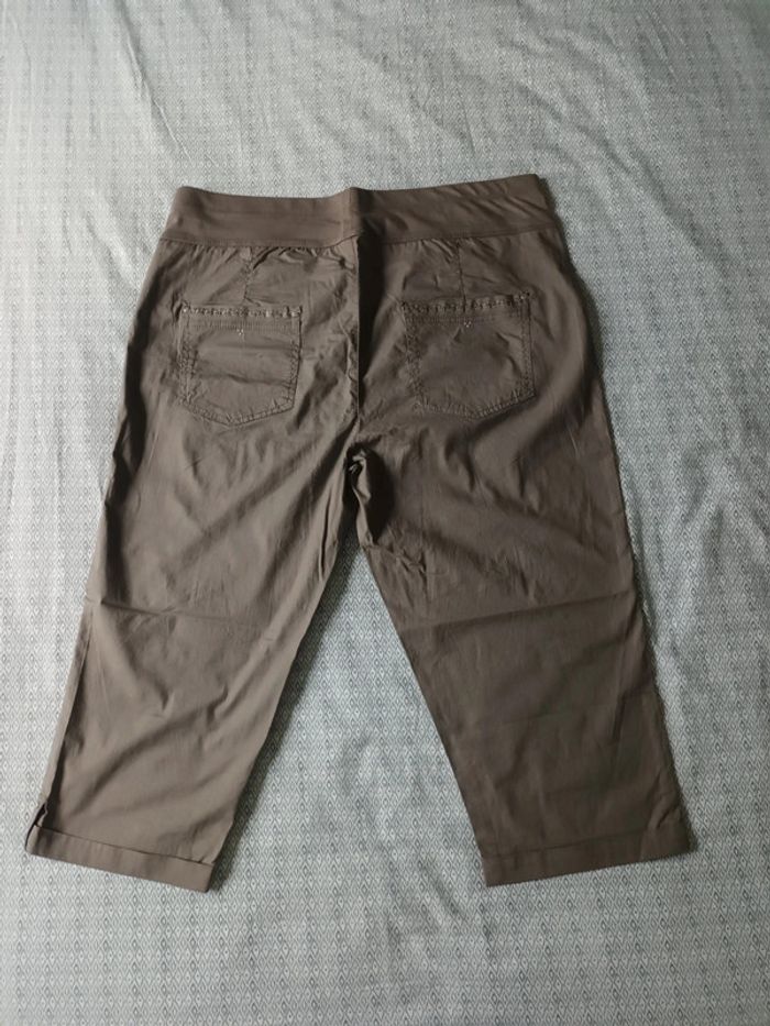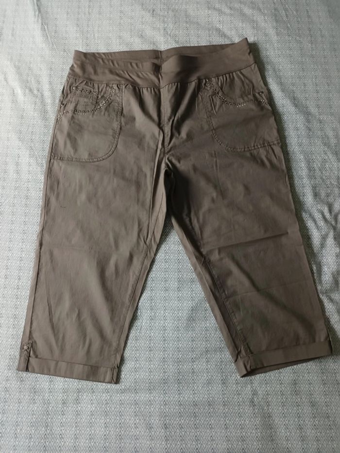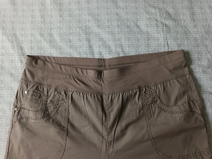 Pantacourt neuf, passants à la taille pour mettre une ceinture, élastique à la taille, petit revers en bas des poches. Une poche de chaque côté à l'avant, et de chaque côté à l'arrière. Longueur totale 74 cm env, Largeur à la taille 46 cm env. Tissu léger et doux. #pantacourtfemme46 #pantacourtgristaupefemme46 #pantacourtneuffemme46