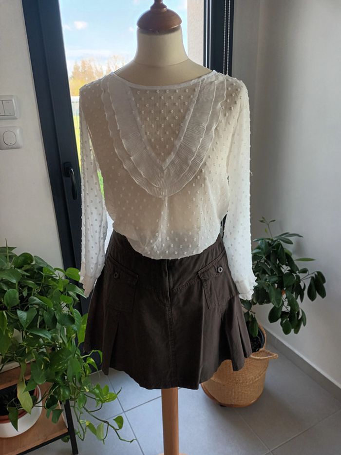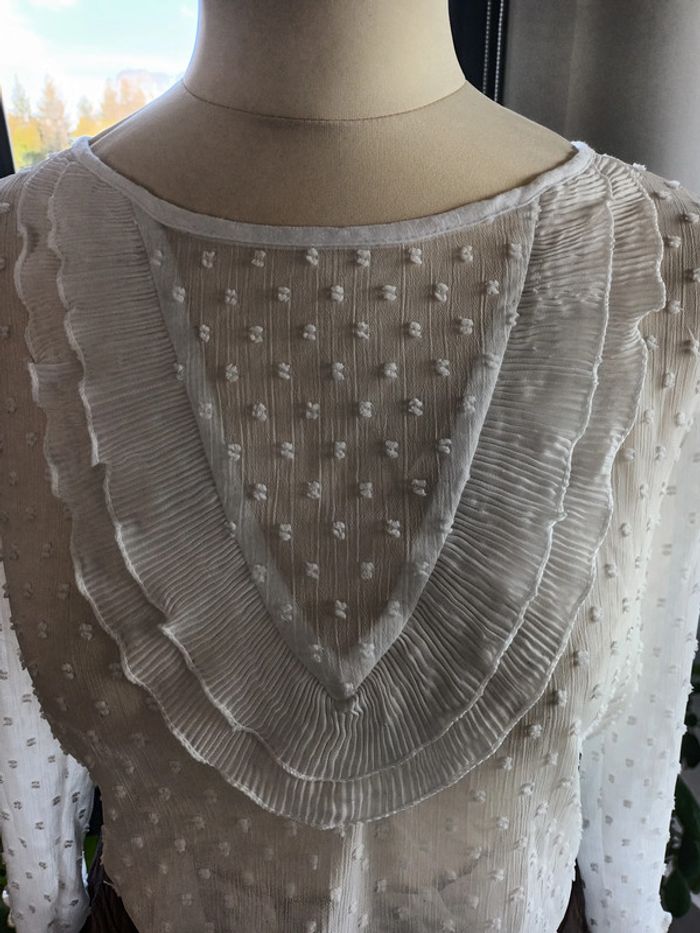Chemisier/Blouse transparente, manches 3/4, indiquée taille S correspond à une taille 38. Largeur épaules : 37 cm env, largeur sous aisselles : 37 cm env, hauteur : 58 cm env. #blouseplumetisfemme38 #chemisierplumetisfemme38 #blousetransparentefemme38 #hautplumetistransparentfemme38 #chemisiertransparentfemme38