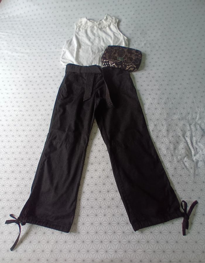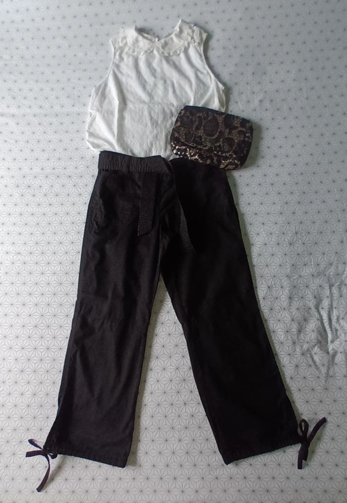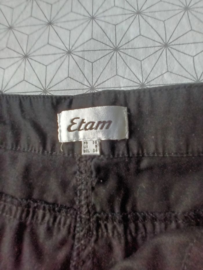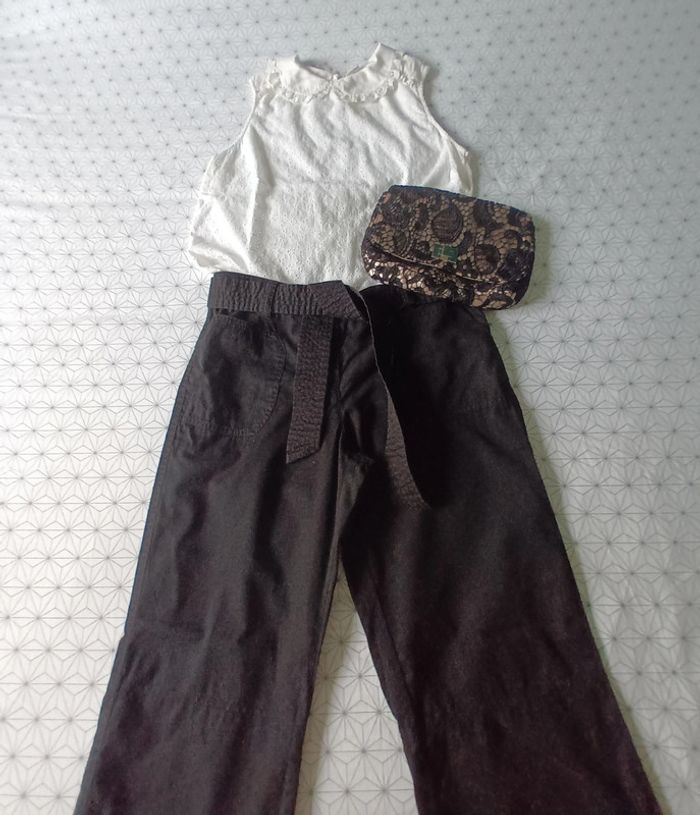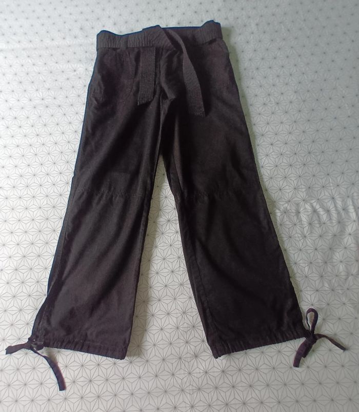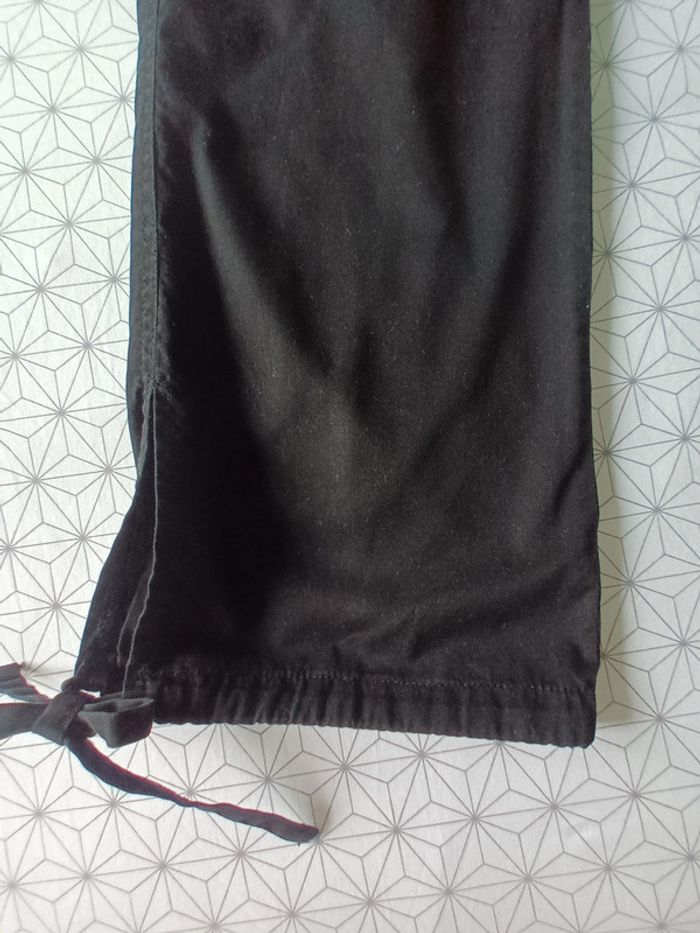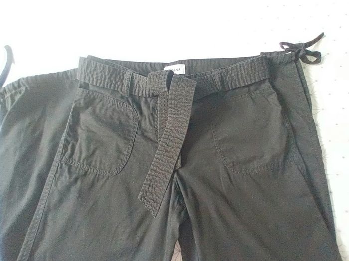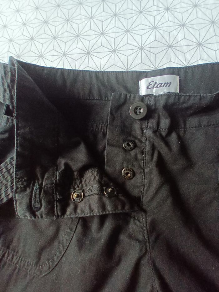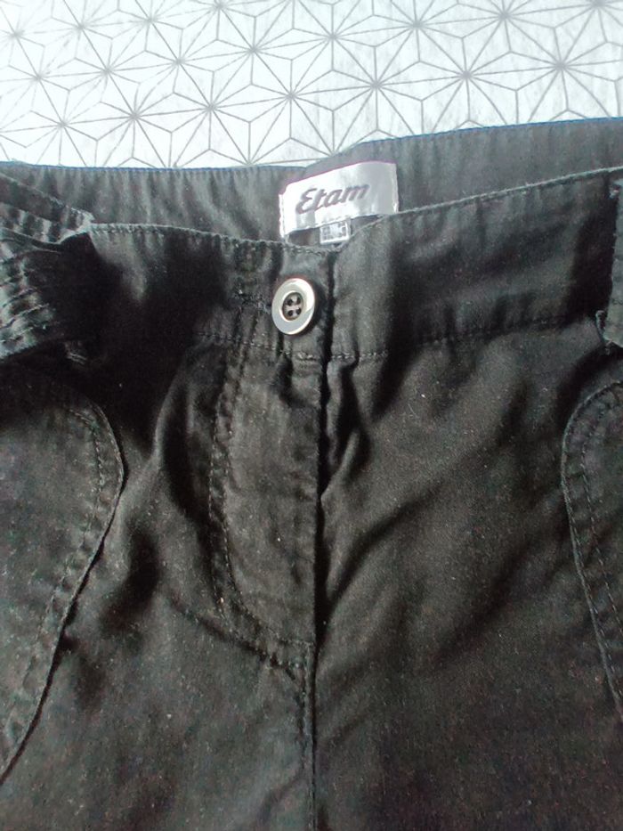 Pantacourt noir avec ceinture assortie, Bas des jambes peut être serré, à l'avant, une poche de chaque côté ainsi qu'à l'arrière. Les poches arrières sont fermées par une fermeture éclair. Taille fermée par 2 pressions noirs et un bouton. Fente d'aisance en bas des jambes. Largeur taille 39 cm env, Longueur 85 cm env, Largeur bas des jambes 20 cm env. Plus d'étiquette de la matière, tissu léger, très peu porté, en excellent état. #pantaloncournoirfemme36 #pantacourtnoirfemme36 #pantaloncourtetam36 #pantacourtjambeslargesfemme36