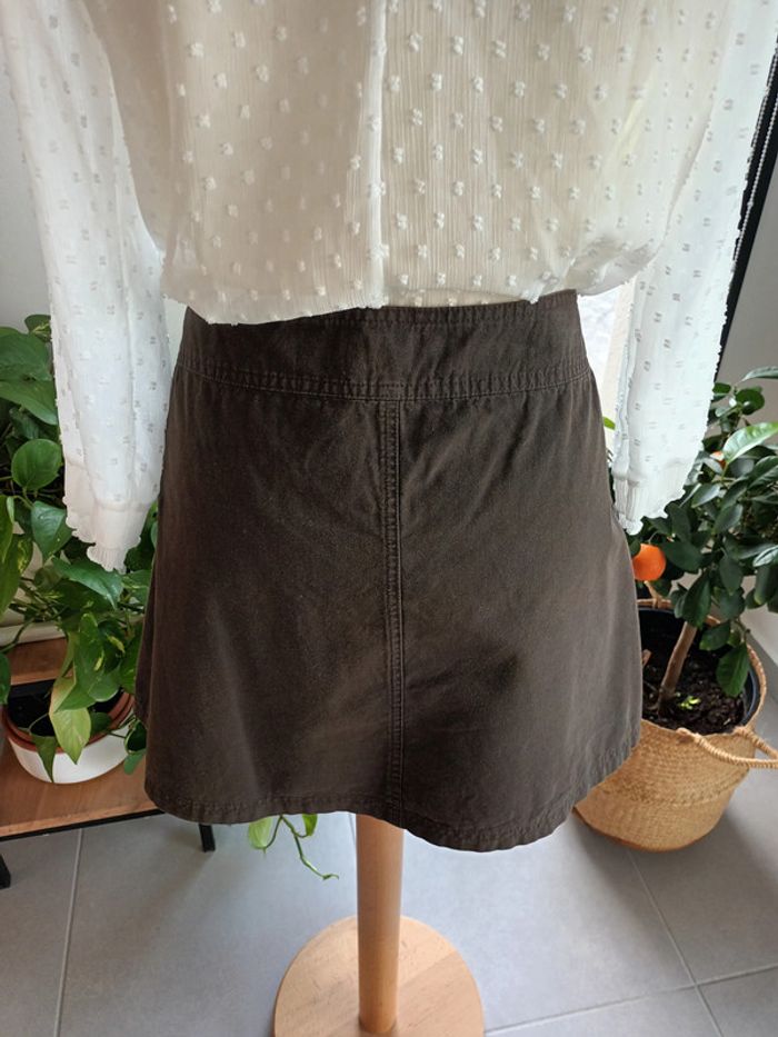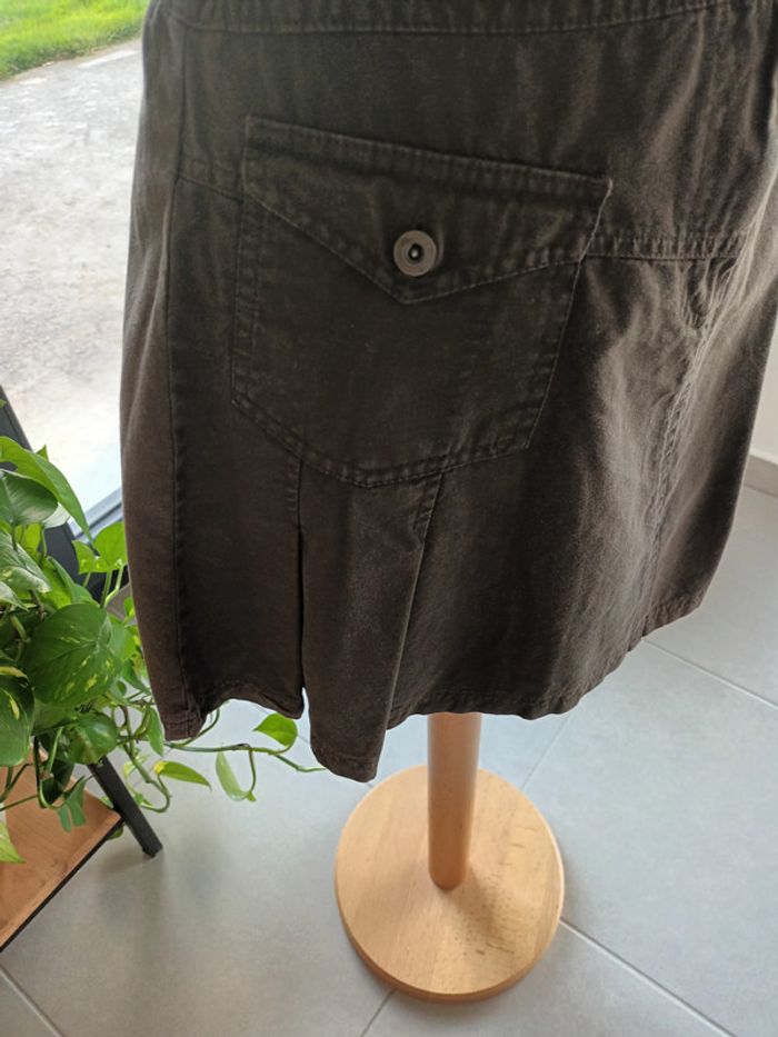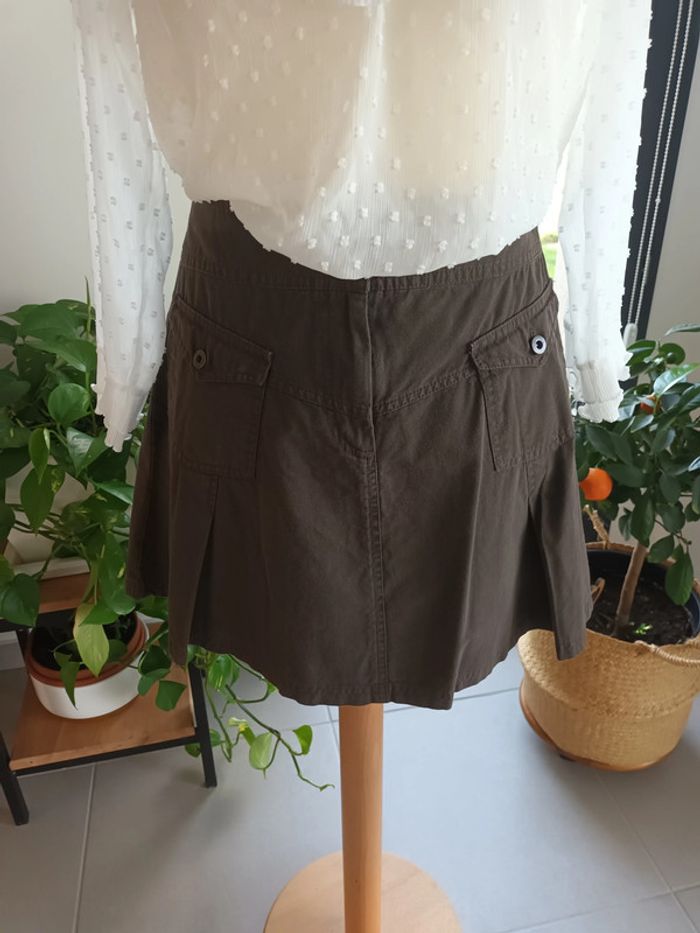 Jupe courte marron, évasée avec des plis et des poches à l'avant, fermeture éclair et 2 boutons à l'avant également. 83% coton et 17% polyester. Largeur à la taille 37 cm env, hauteur 40 cm env. #jupecourtefemme38 #jupemarron38 #jupeaplis38 #jupeavecpoches38 #jupecourteevasee38 #jupepatineuse38