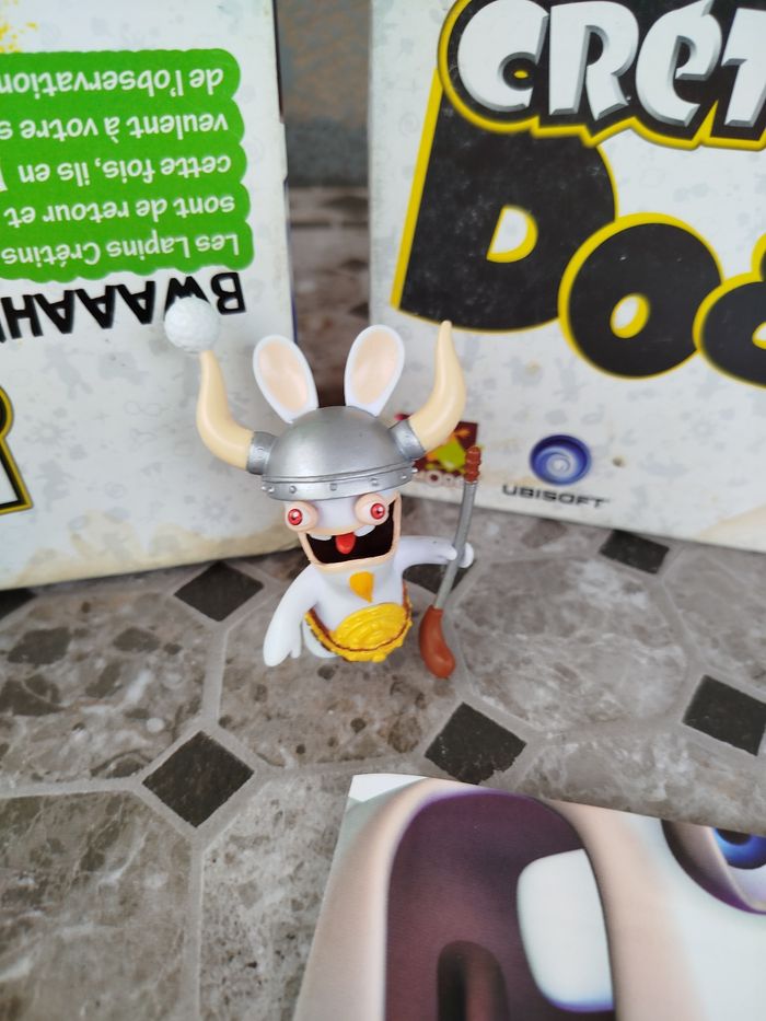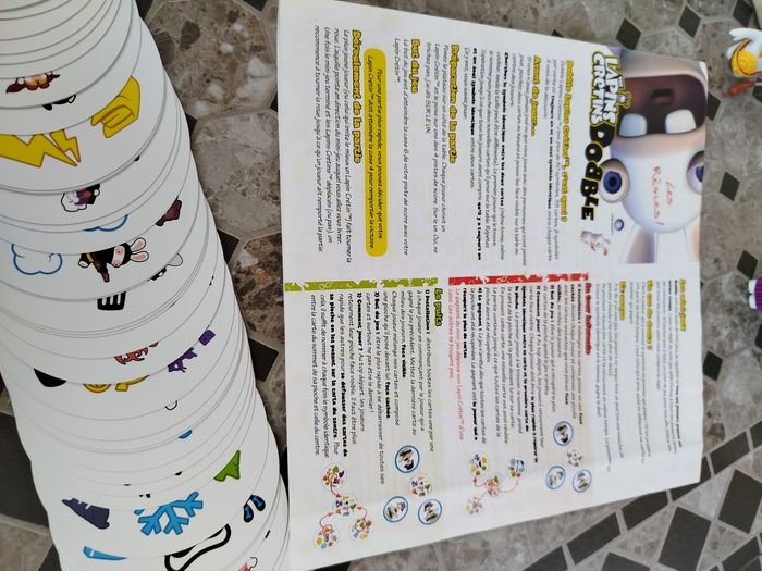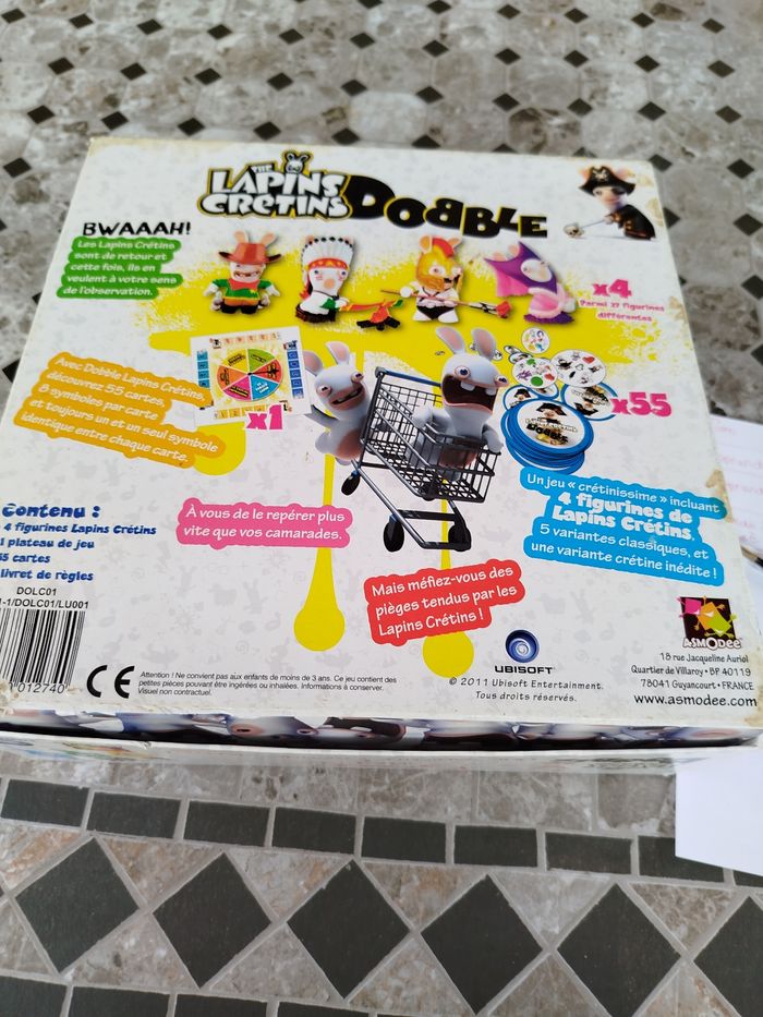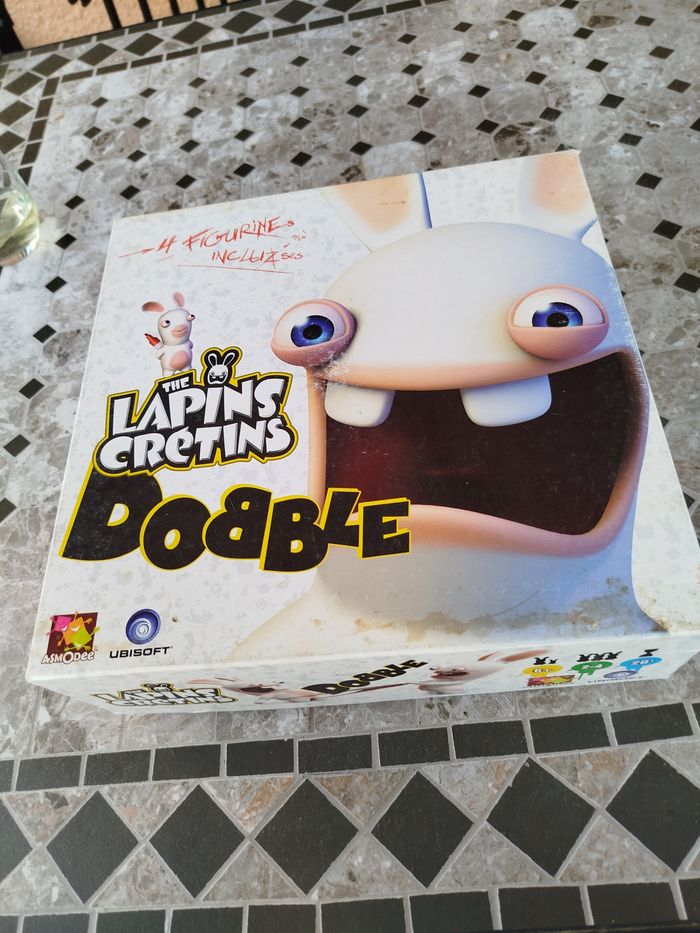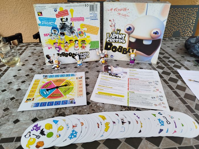 Dobble édition lapin 🐰 crétin Les lapins crétins sont de retour et cette fois, ils en veulent à votre sens de l'observation. Avec double lapins crétins, découvrez 55 cartes, 8 symboles par carte et toujours un et un seul symbole identique entre chaque carte À vous de repérer plus vite que vos camarades Mais méfiez-vous des pièges tendus par les lapins crétins Un jeu crétinissime un client 4 figurine de lapins crétins, 5 variante classique et une variante crétine inédite État : très bon état Âge : 6@ et plus Nbrs de joueurs : 2-4