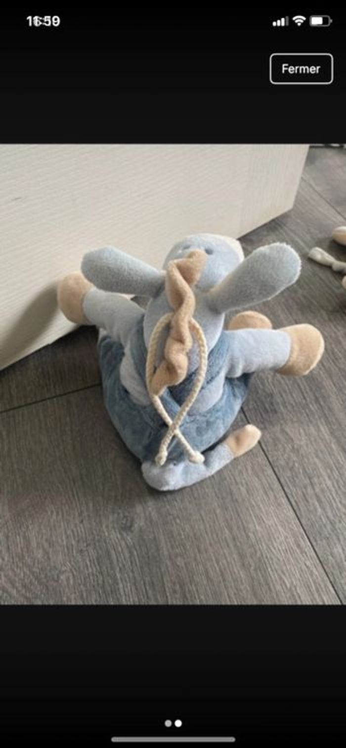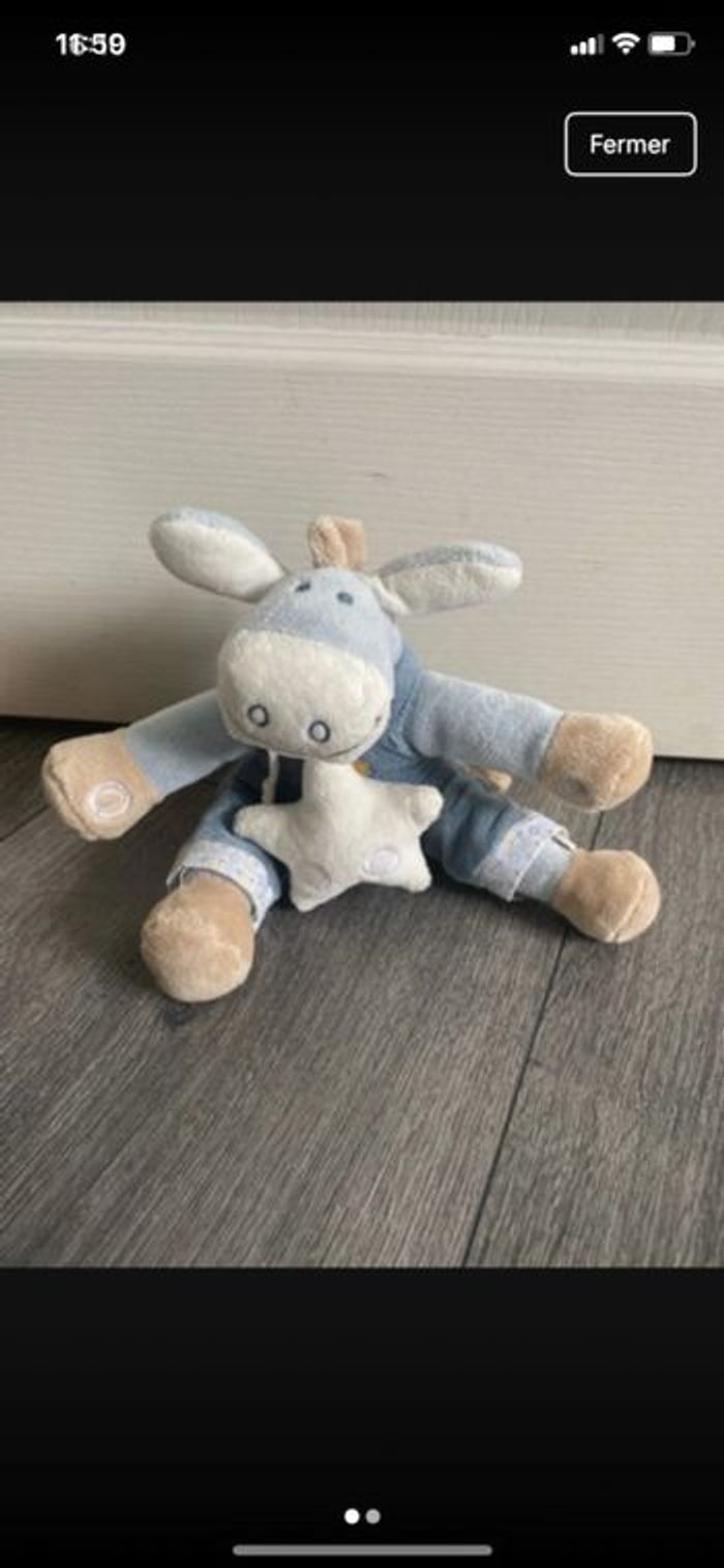 Peluche musicale âne Noukie ´s peu utilisée.Tirer sur l'étoile pour la berceuse.Peut s'accrocher avec les cordes.