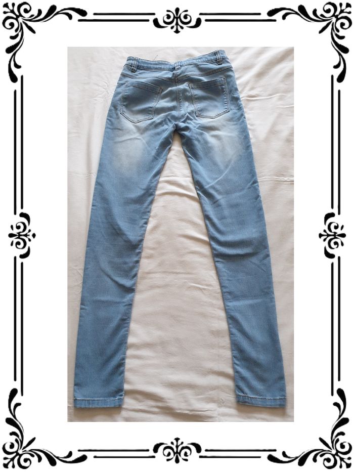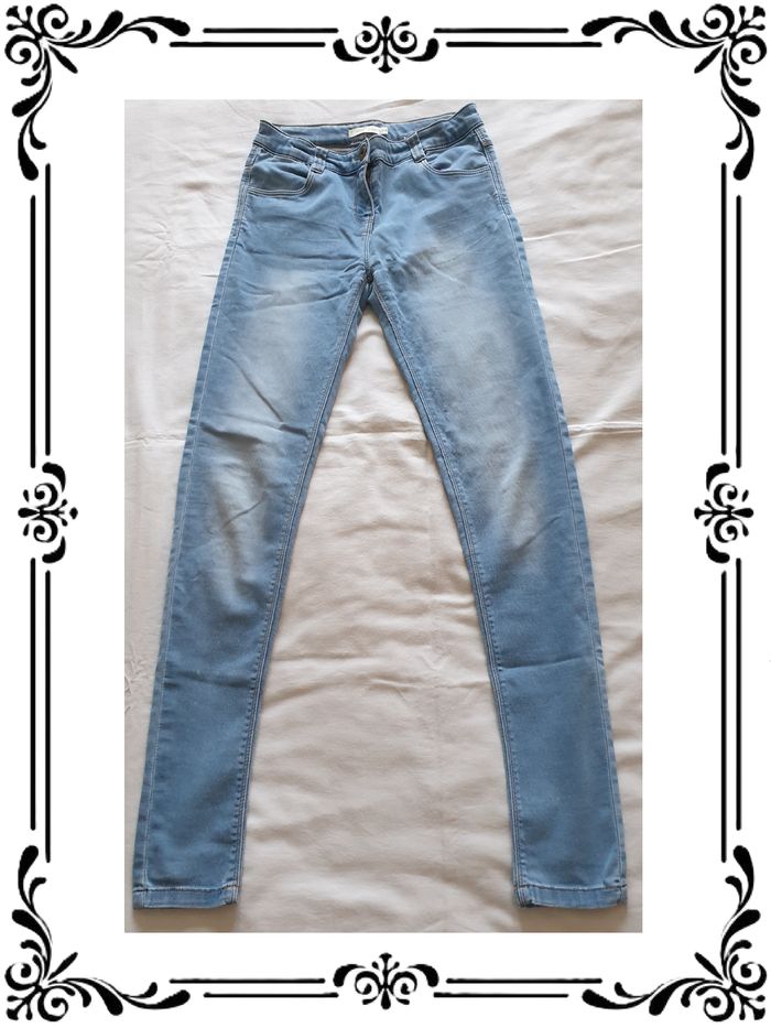 Jean 14 ans. Jean slim bleu clair effet usé. Une poche chaque côté devant et derrière. Taille réglable avec élastique et boutons. Tissu extensible sur 4 cm. Légère usure des coutures au niveau de l’entrejambe. 61 % coton, 37 % polyester, 2 % élasthanne. Largeur à la taille : de 32 à 36 cm Largeur bassin : 38 cm Largeur de cuisse : 20,5 cm Largeur bas de jambe : 11,5 cm Longueur totale : 93 cm Longueur de jambe à partir de l’entrejambe : 71 cm En bon état. Gémo. 2,00€. #vero38110quatorzeansfille
