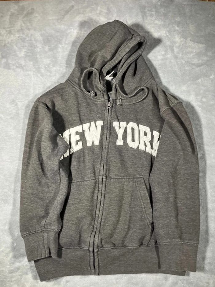 Ce sweat à capuche zippé de couleur gris anthracite affiche une inscription "NEW YORK" en grandes lettres blanches sur le devant, dans un style universitaire classique. Il est doté d’une capuche doublée avec cordon de serrage assorti, d’une fermeture éclair centrale, ainsi que de deux poches kangourou. Confectionné dans une matière molletonnée douce, il est idéal pour un look casual ou sportif au quotidien. #NewYorkSweat #SweatCapuche #GrisAnthracite #Streetwear #LookDécontracté #StyleUniversitaire #SweatZippé #ModeUrbain #VêtementUSA #VintedFrance #SecondeMain