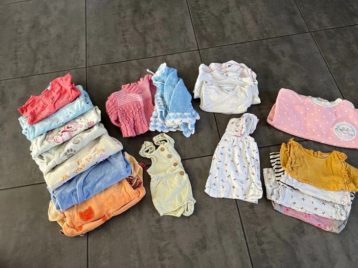 Lot 1 mois fille 7 pyjamas, 2 gilets, 1 combi, 1 robe, 3 bodies, 1 sweat, 4 tee-shirts Très bon état général #aliciabregerfilleunmois