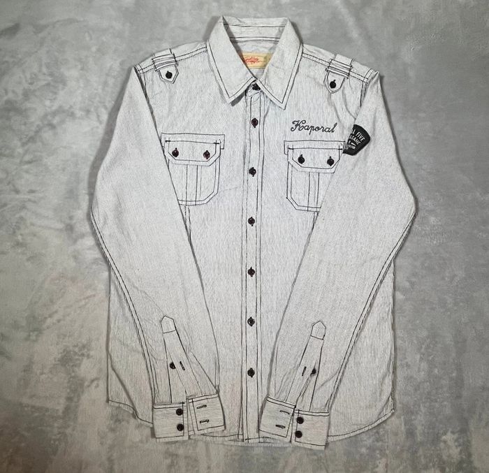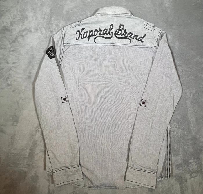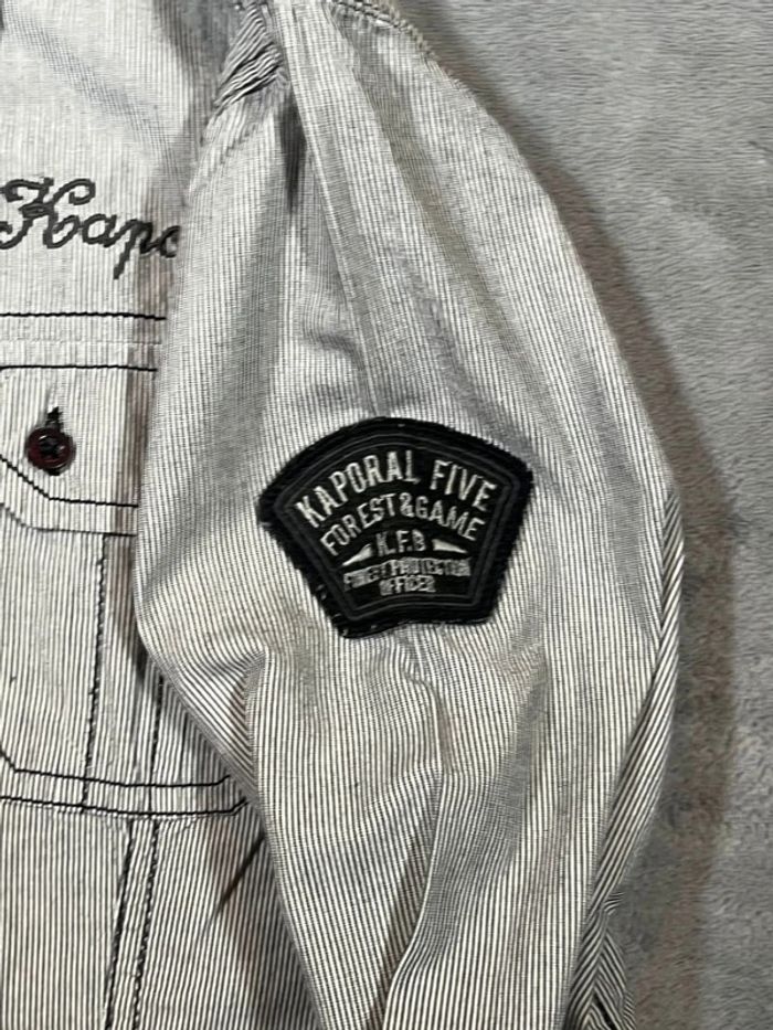 Chemise Kaporal pour femme, au style urbain et tendance, avec un motif camouflage dans les tons gris, noir et blanc. Coupe droite féminine, fermeture à boutons pression sur toute la longueur, deux poches poitrine à rabats, et petit logo brodé "Kaporal Jeans" sur la poitrine gauche. Tissu fluide et agréable à porter, parfaite pour un look streetwear, rock ou décontracté. #Kaporal #ChemiseFemme #CamouflageStyle #ModeFemme #StreetwearFemme #LookDécontracté #SecondeMain #VintedFrance #KaporalJeans #FashionFind #ChemiseTendance #BonPlanMode