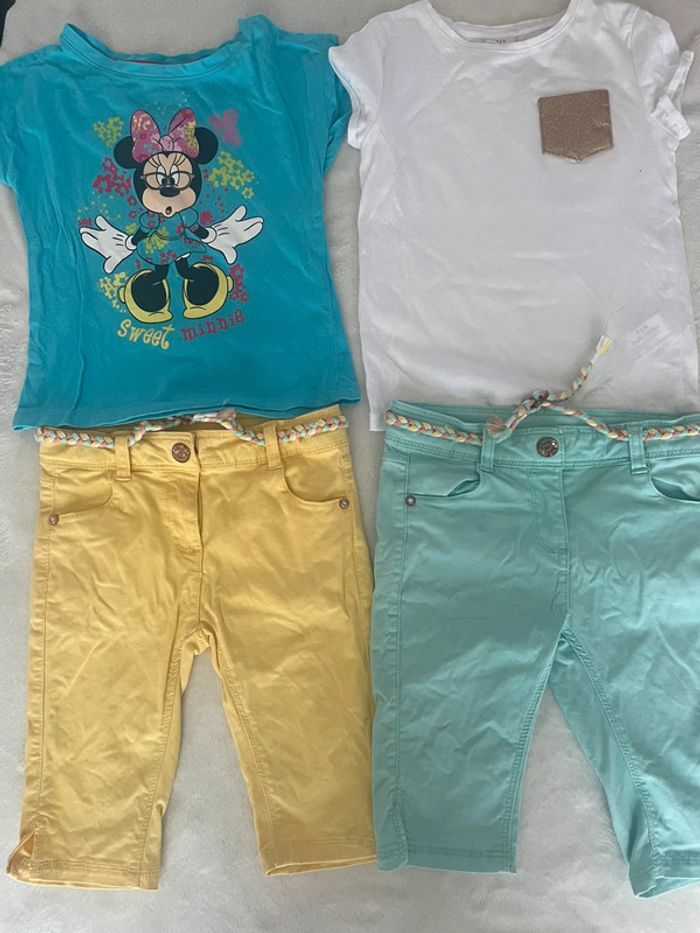 Deux ensembles taille quatre ans. Le pantacourt jaune est offert car quelque traces Les deux pantacourt orchestra Un haut tape à l’œil et un Disney