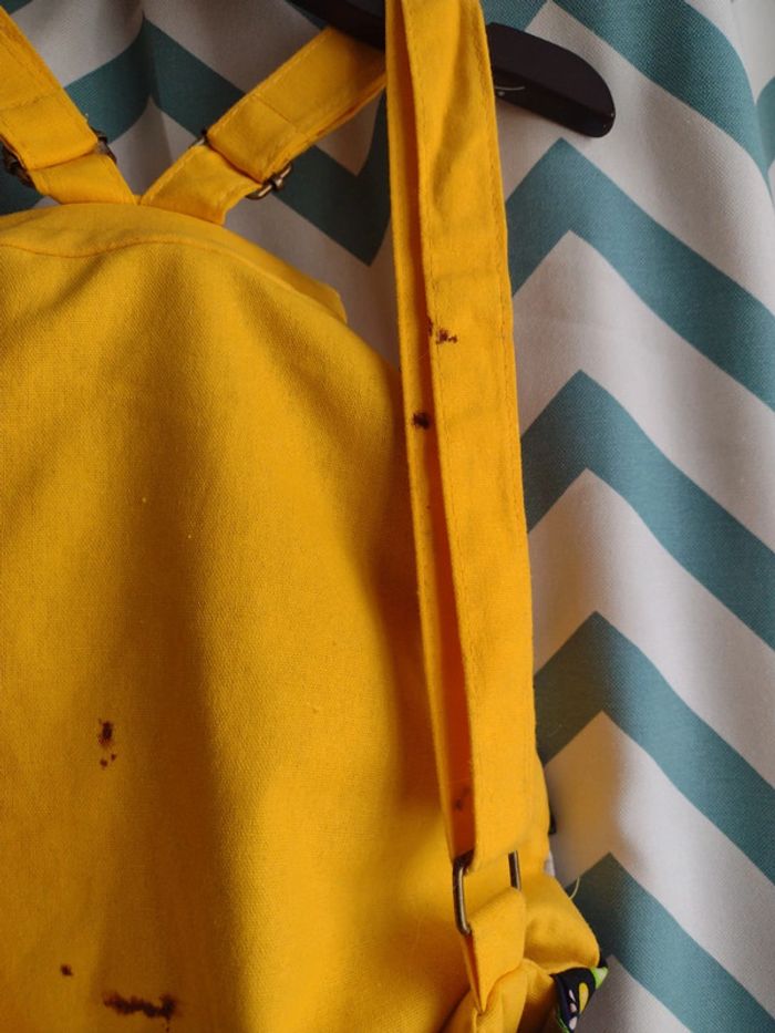 Sac à dos entièrement en tissu, jamais utilisé mais il s'agissait d'une fin de stock d'été et le sac présente au dos des traces de rouille à cause de l'une de ses réglettes en métal située sur une des bandoulières d'où le prix.