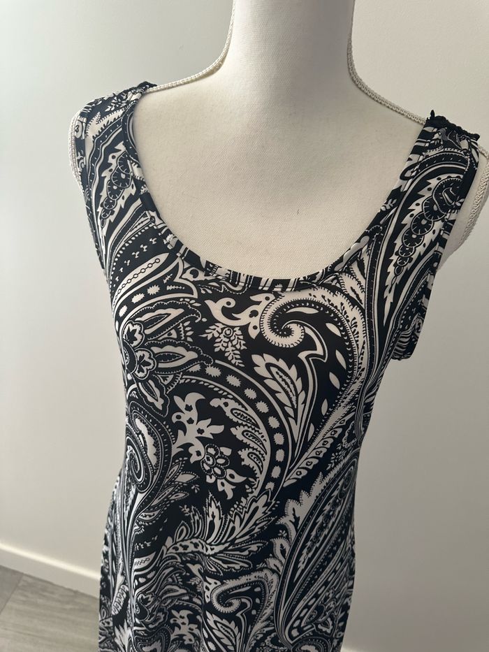 Robe - Excellent état - Taille 38 équivalent M Dimensions en bas de l’annonce - Noire et blanche - Imprimés Paisley - Dentelle dans le dos - Polyester et élastane Dimensions: - 46 à 57cm niveau aisselles - 115cm de long