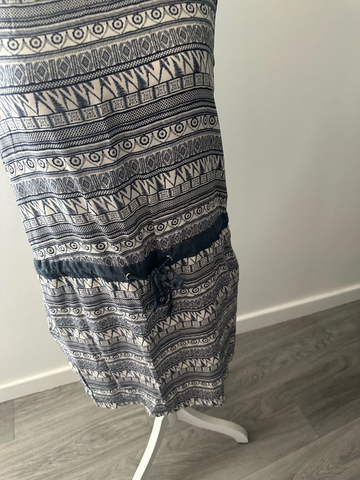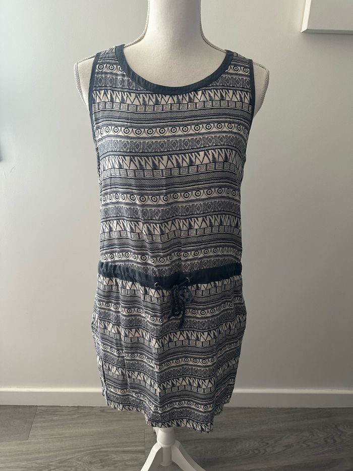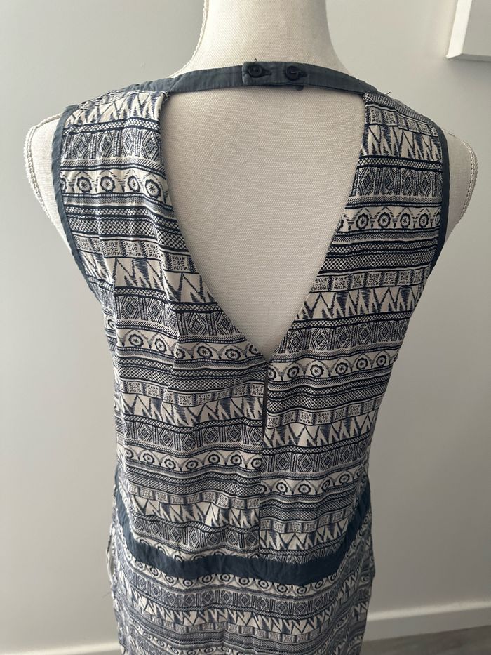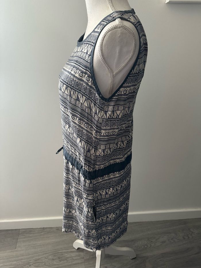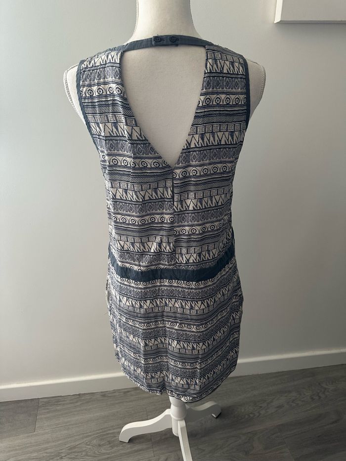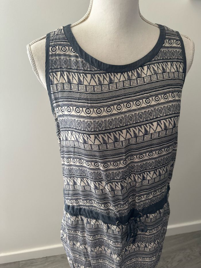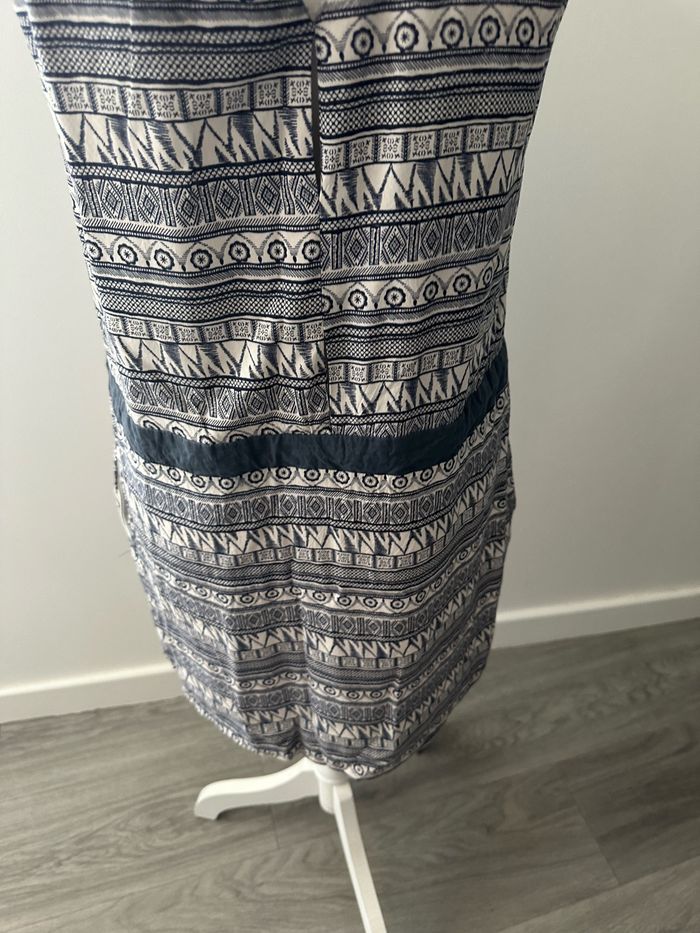 Robe - Excellent état - Taille 36 équivalent S Dimensions en bas de l’annonce - Blanche et bleue - Imprimés ethniques aztèques - Cordon à la taille - Doublure sur la partie basse - Ouverte dans le dos - 100% viscose Dimensions: - 50cm niveau aisselles - 84cm de long