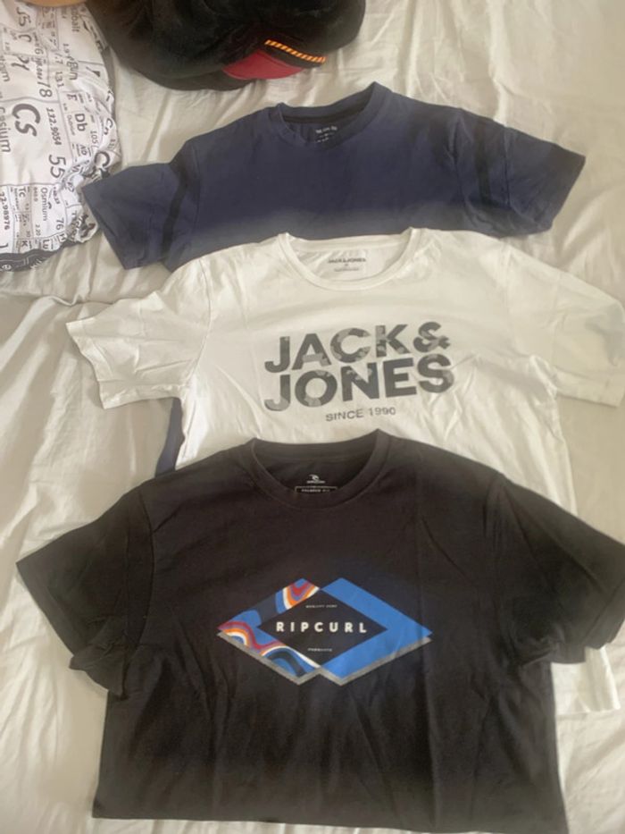 Taille M Différentes marques : celio, jack & jones et rip curl Ils sont tous les trois avec des imperfections qui seront mis en évidence en photo. Elles ne se voient pas tant sur ça. Les tee-shirts peuvent être utilisés pour bricolé pour une sortie qui craint… #babohommem