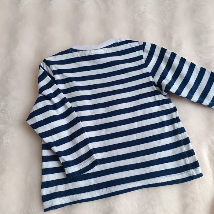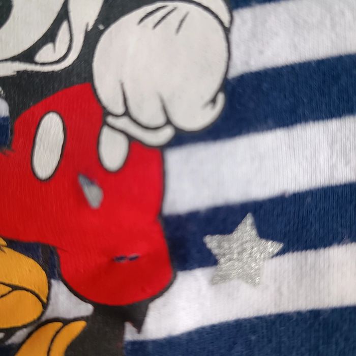 T-shirt Mickey rayé blanc et bleu. Imprimé Mickey de la marque Disney baby en 12 mois en bon état général voir dernière photo.