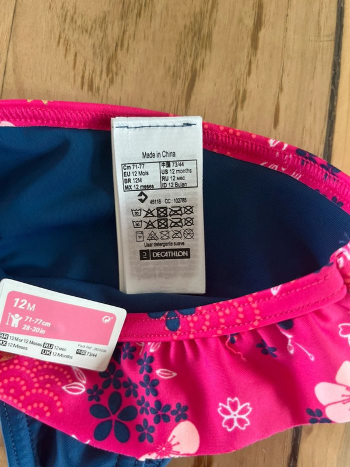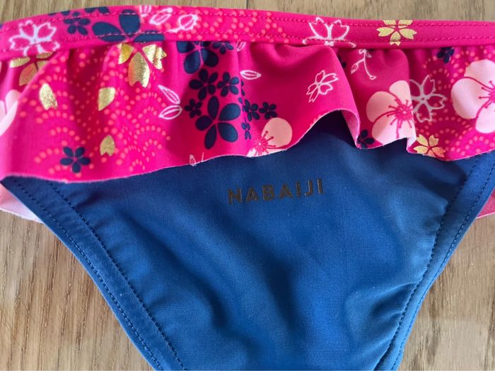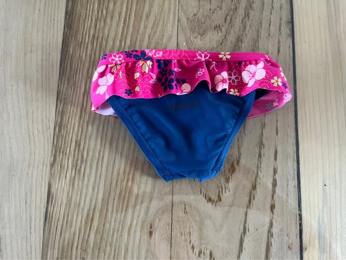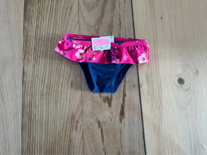Culotte de maillot de bain bleu marine et rose fuchsia, motif fleuri. Marque Nabaiji. Taille 12 mois.