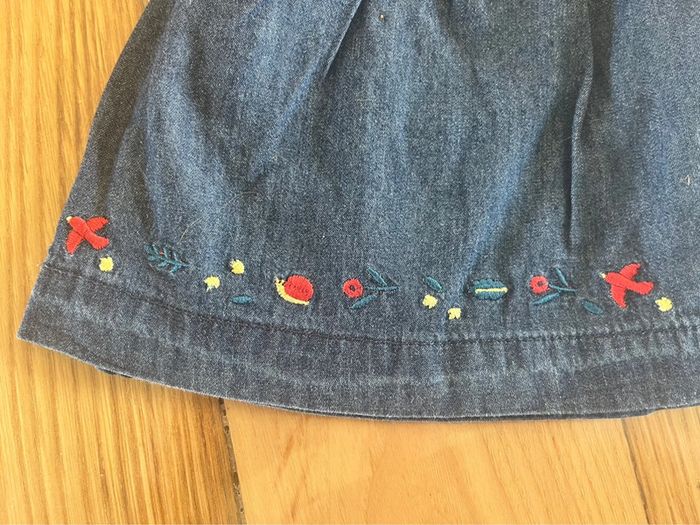 Détails : petite souris sur la poche, oiseaux et fleurs brodés en bas