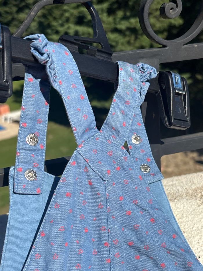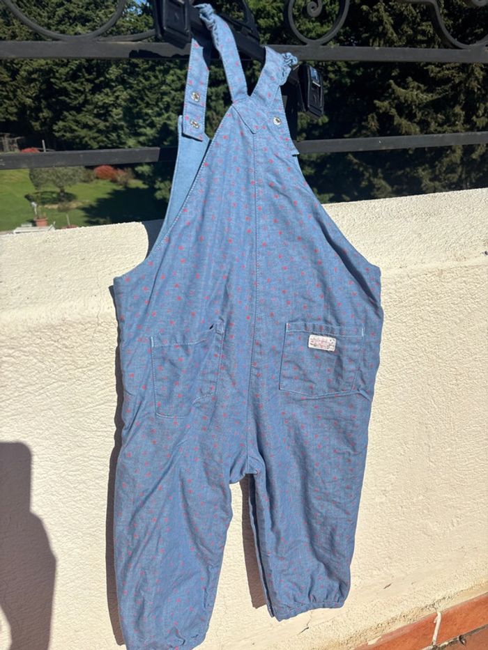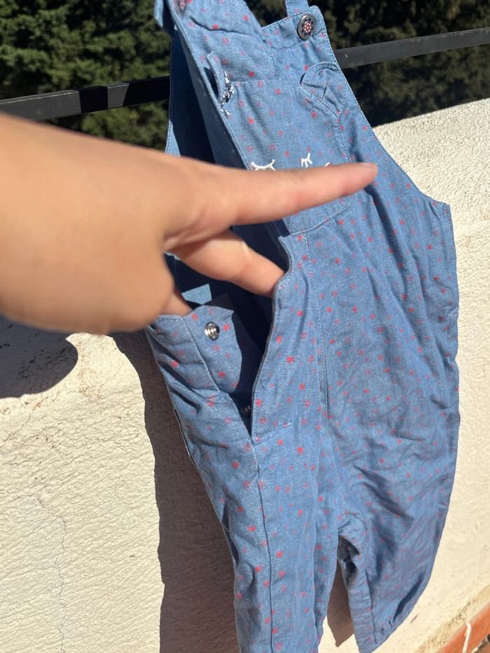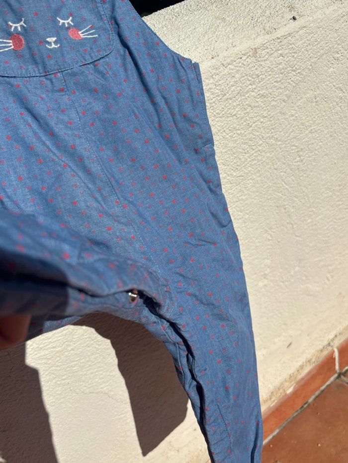 Salopette 24M en excellent état. Pas de trou ni de tache Couleur jean avec pois rouge. Motif chat sur le devant et poche à l arrière. Tissus épais double. Maison non fumeur. Envoi rapide.